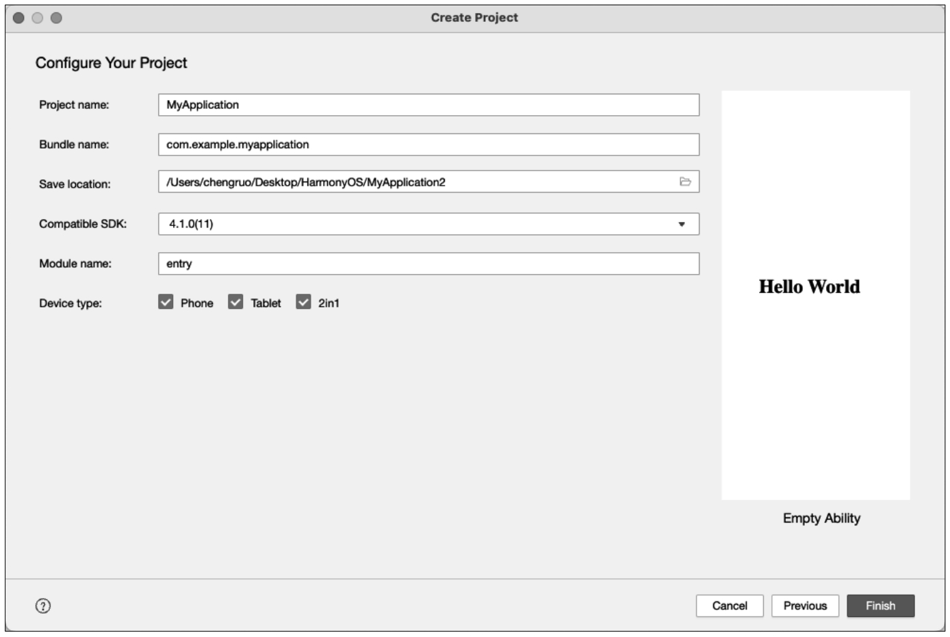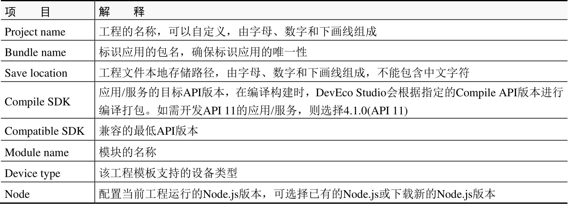 注意 单击Finish按钮之后,DevEco Studio会自动进行工程的同步。等待工程同步完成之后就可以在界面右侧看到预览效果图了,如图1-10所示。创建工程页面的各项目参数解释如表1-3所示。