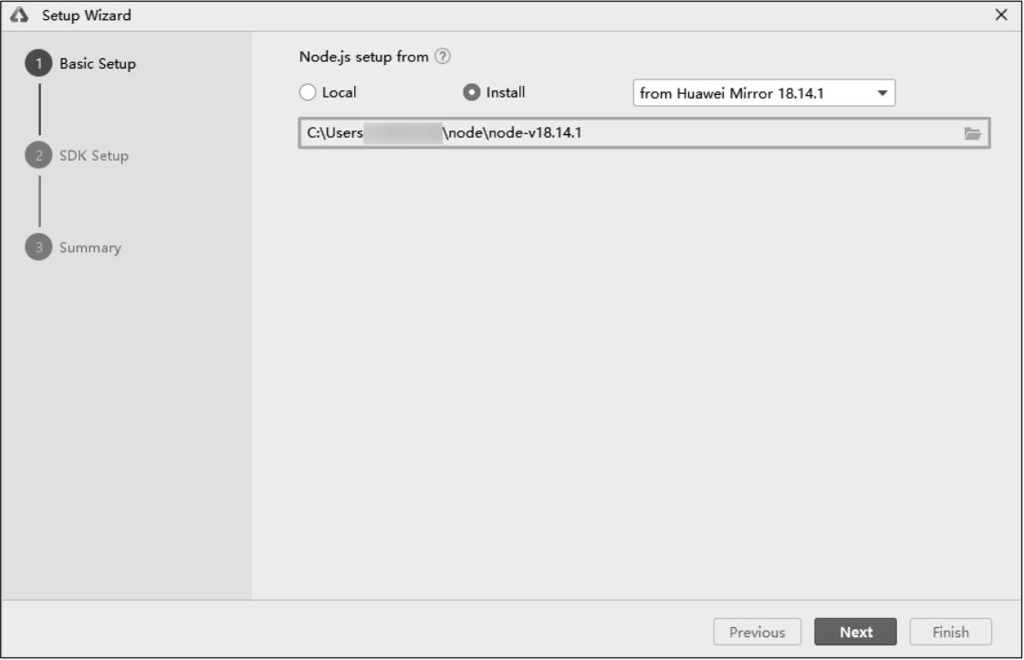 02 安装Node.js。单击Local选项,可以指定本地已安装的Node.js(IDE级别)路径位置,如果本地没有合适的版本,可以单击Install选项,选择下载源和存储路径后进行在线下载;然后单击Next按钮进入下一步,如图1-6所示。