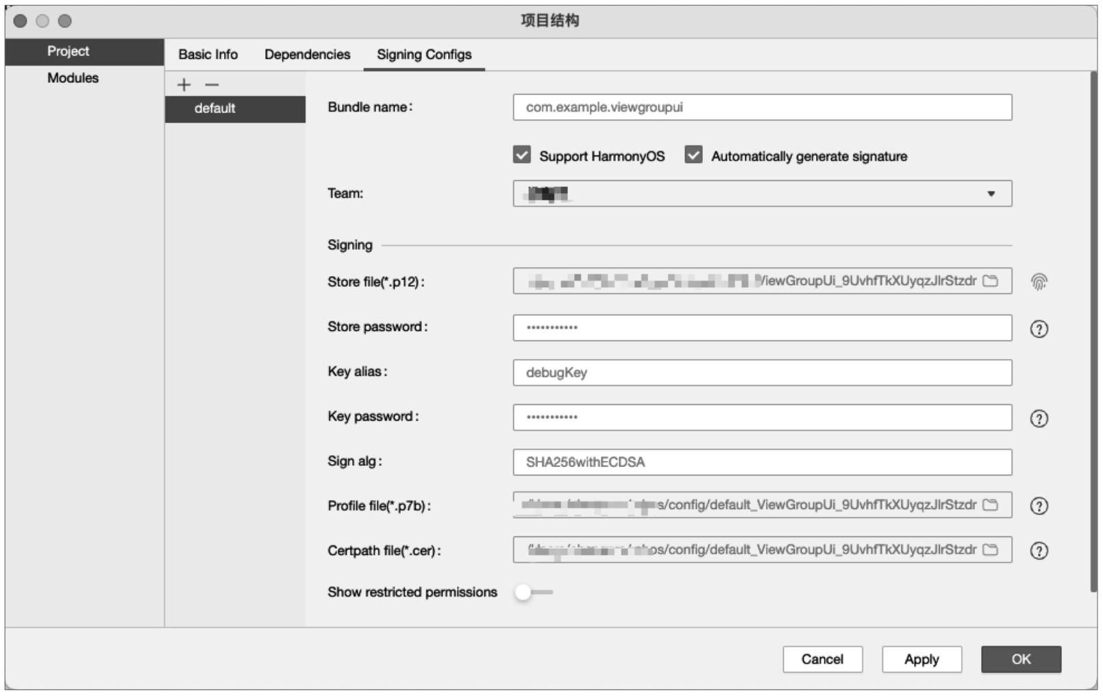 02 单击File→Project Structure...→Project→Signing Configs,勾选Support HarmonyOS和Automatically generate signature复选框,单击界面提示中的Sign In按钮,使用华为账号登录。等待自动签名完成后,单击OK按钮即可,如图1-11所示。