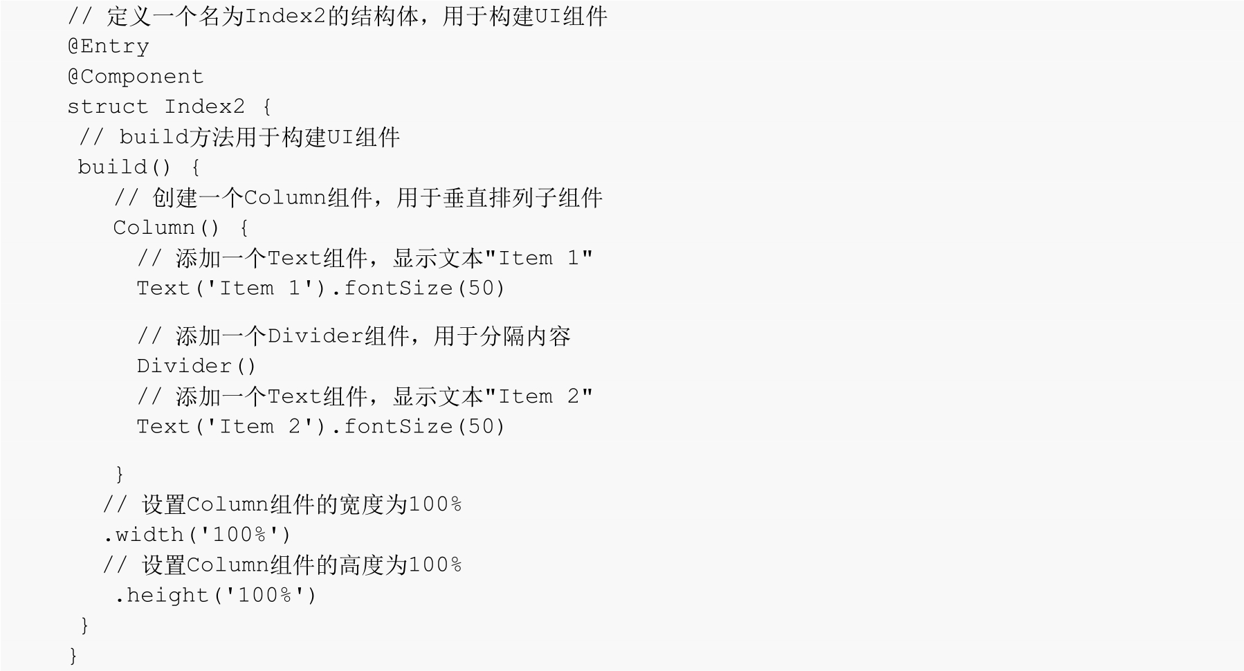 例如,Divider组件不包含构造参数,展示的是一条横线;Text组件用于展示文本。代码如下: