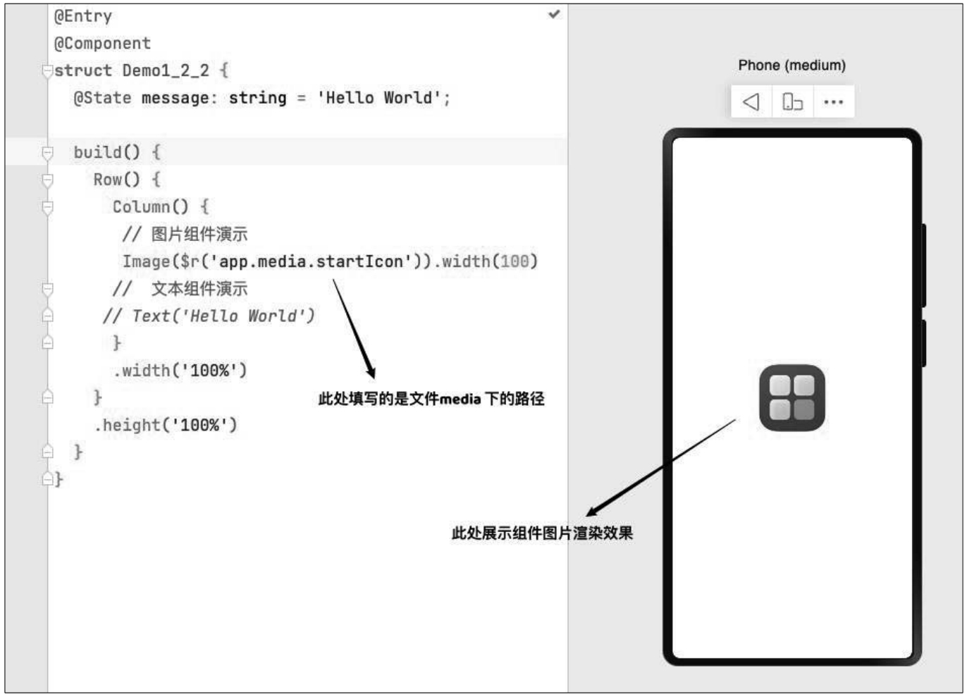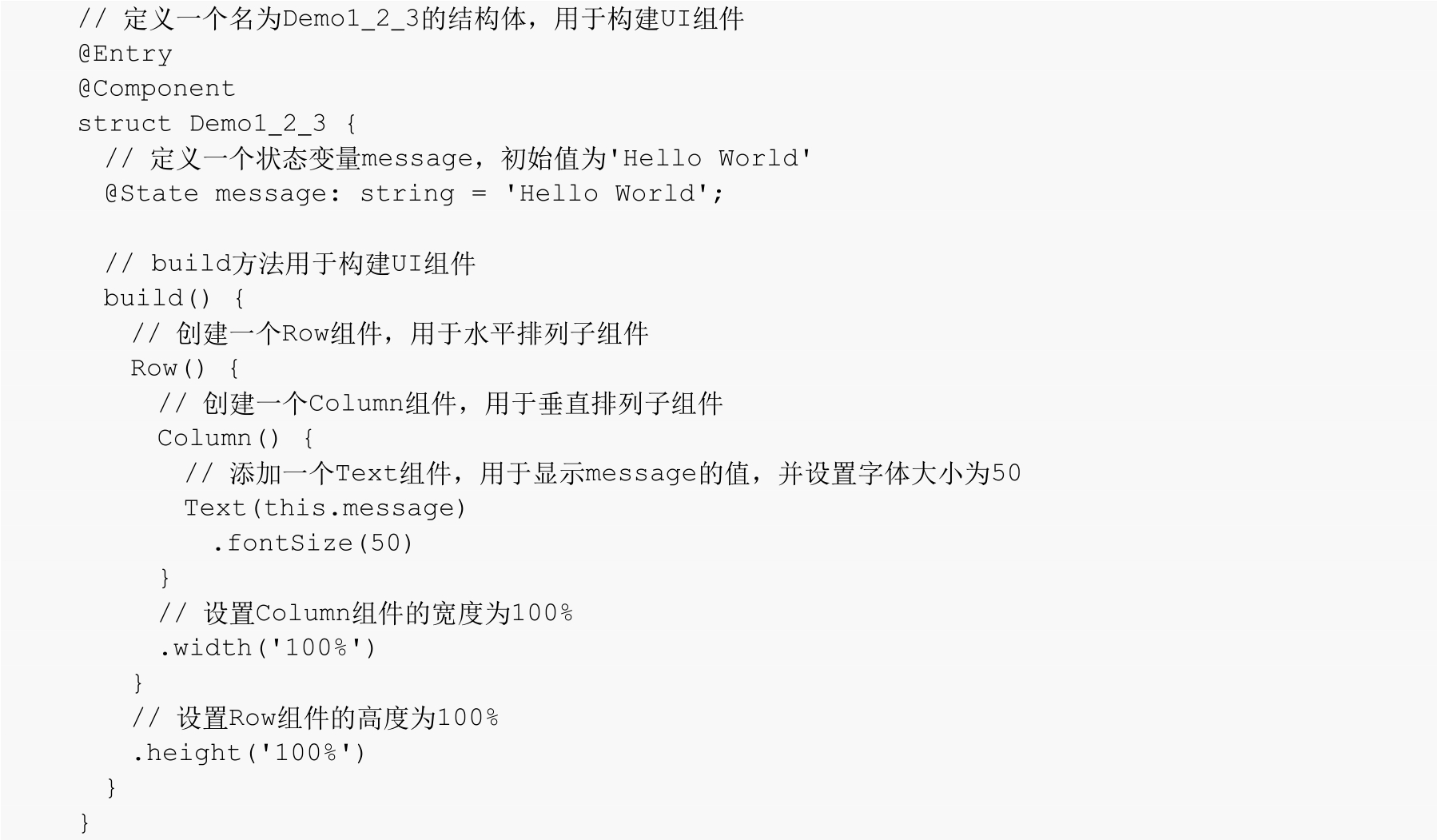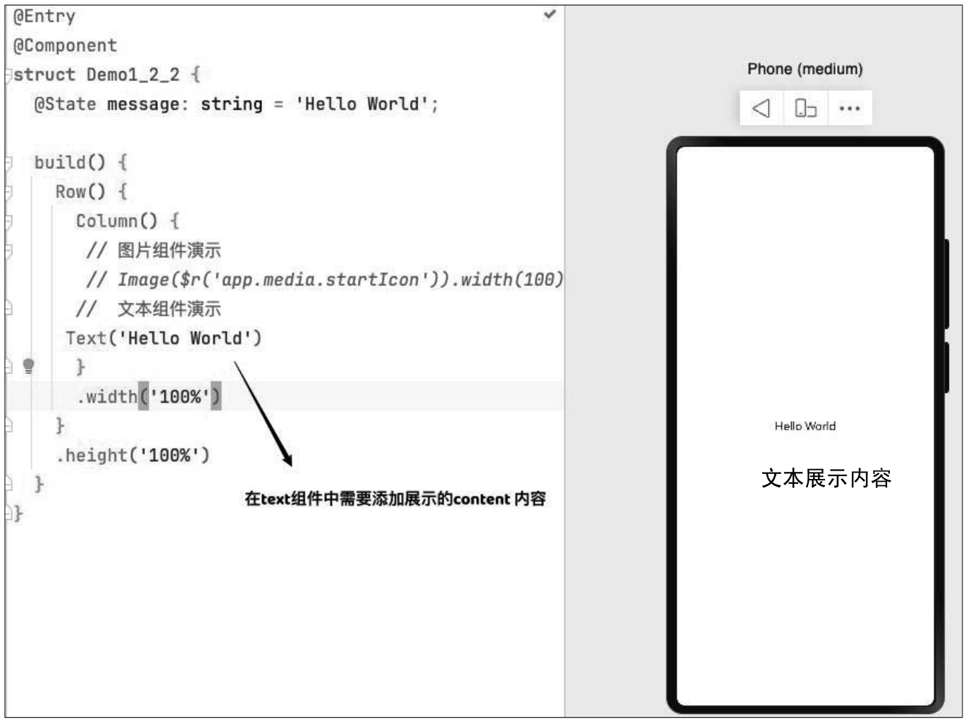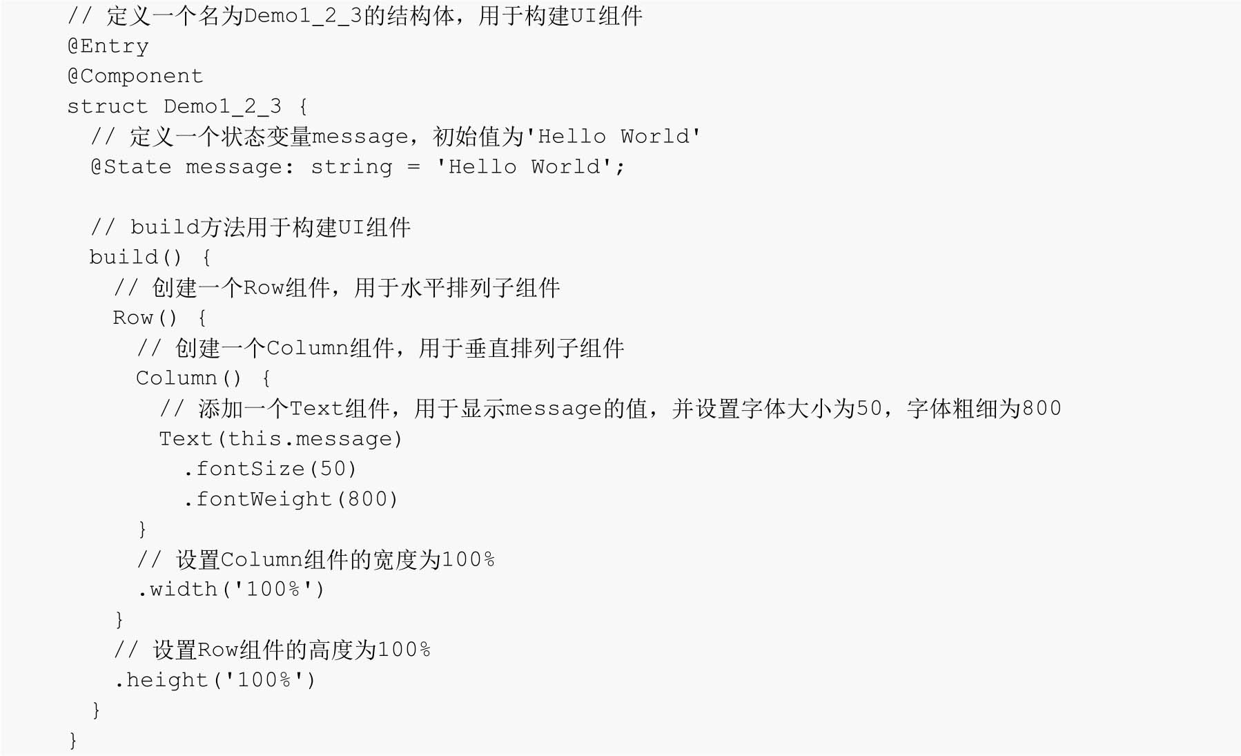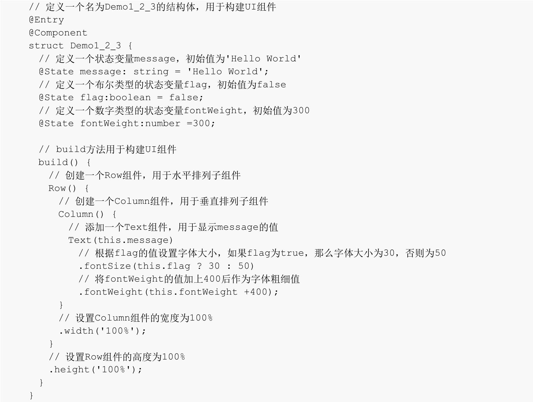 在1.2.4节中会发现,所有的Text组件或者Button组件都在容器组件Column中,当然它们的属性也在对应的组件后面进行添加。