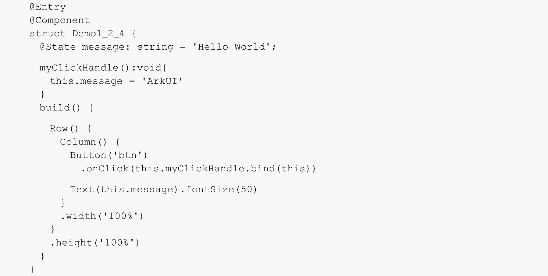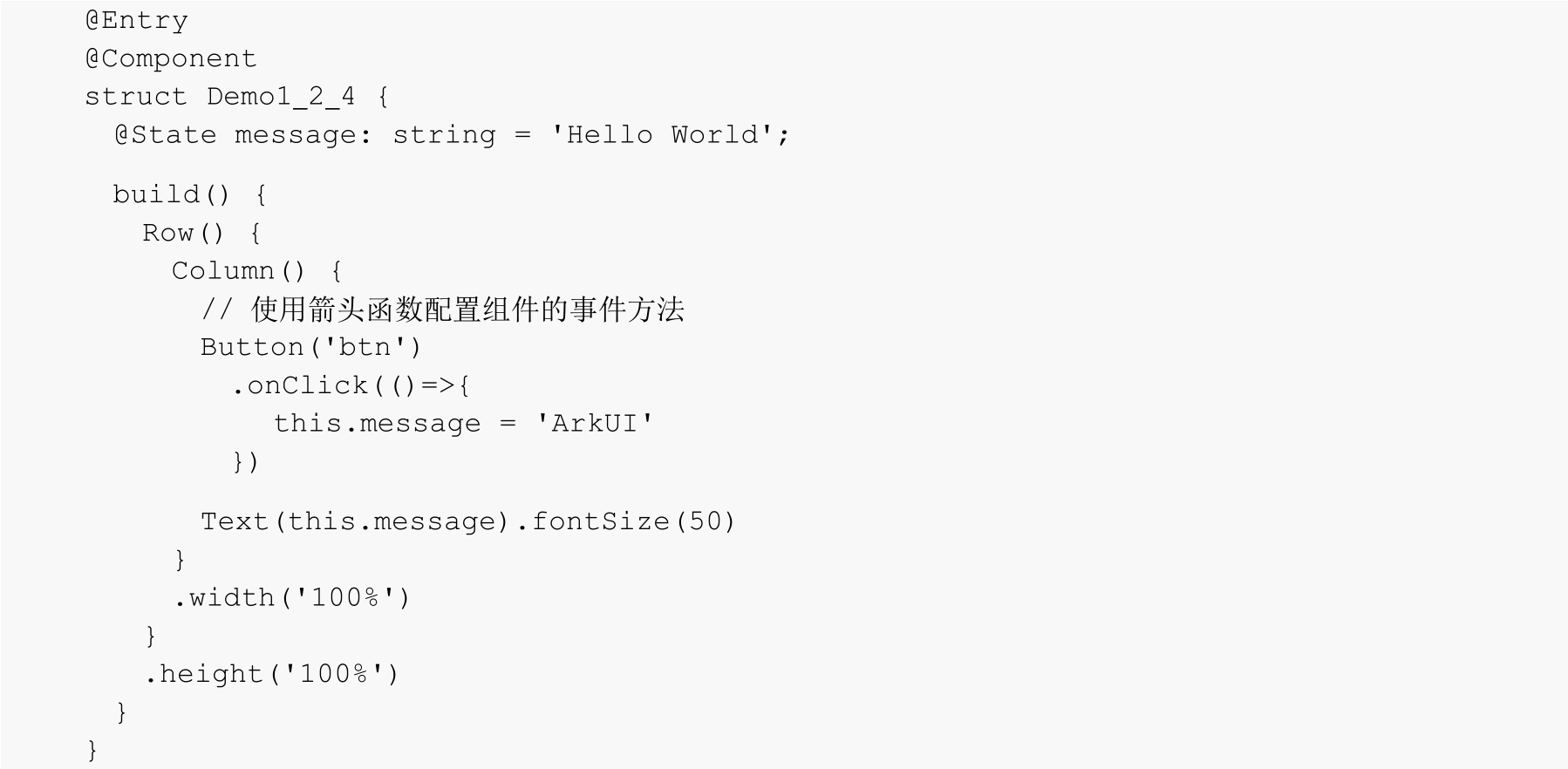 在上述示例代码中,为Button组件绑定了箭头函数,当单击Button按钮时,Text组件的文本发生改变。界面效果如图1-23和图1-24所示。