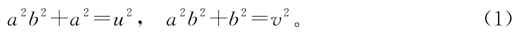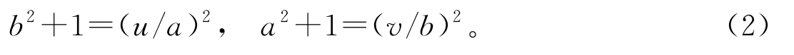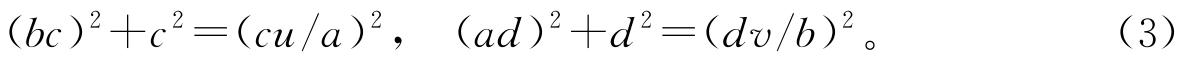 接着,通过去掉分母把式(2)中的正有理数都化为正整数,即选取正整数 c 使得 bc 和 cu / a 均为正整数;同理选取正整数 d 使得 ad 和 dv / b 也都是正整数。在式(2)中的两个方程的两端分别乘以 c 2 和 d 2 ,则式(2)可等价地变换为