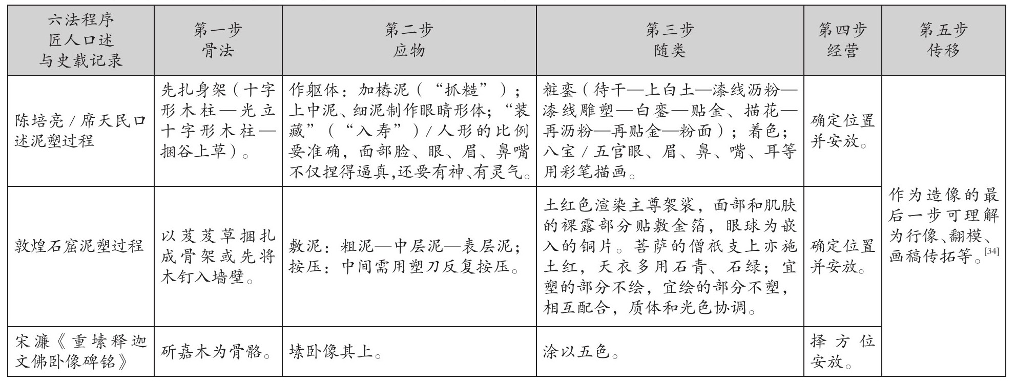 依《古画品录》序原文看,“六法者何。一气韵。生动是也。二骨法。用笔是也。三应物。象形是也。四随类。赋彩是也。五经营。位置是也。六传移。模写是也”。其排序依次为:气韵—骨法—应物—随类—经营—传移,即:①生动——有气息韵动,栩栩如生,此为首要目标:②用笔(刻刀)——依循骨骼(格);③象形——心物相应;④赋彩——依类敷色、依色寻类;⑤位置——确定位置并安放;⑥传移——模制或模写(复制)。如果仔细分析不难发现,这一排序与泥塑造像程序吻合,特别值得注意的是做雕(泥)塑程序解释的话,极易被现代研究者忽略的塑像“随类赋彩”环节排序为第四是合乎雕(泥)塑程序的。从泥塑造像的实际制作上,我们可以看到造塑全程与“六法”的排序相吻合。 [20] 现依照敦煌石窟泥塑过程、 [21] 晋江深沪泥塑制作传人陈培亮和青州民间画塑老艺人83岁的席天民(曾塑过云门山、范公亭等多处的大型泥像)口述, [22] 以及宋濂在《重塐释迦文佛卧像碑铭》所描述画塑的程序列表如表4。 [23]