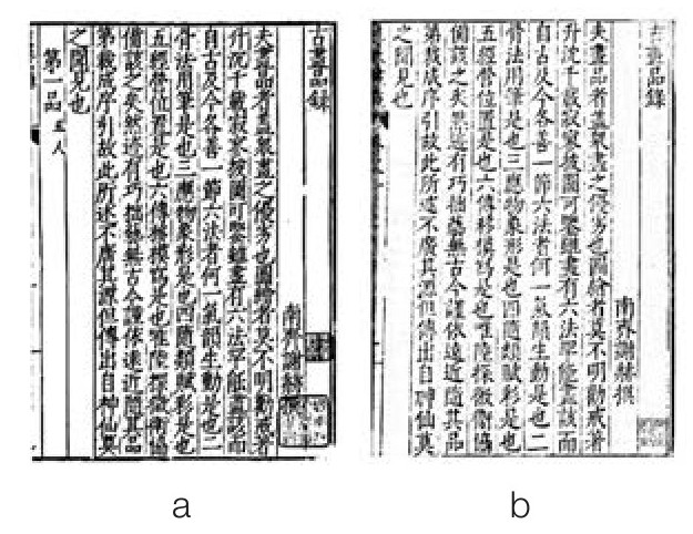 图2 《古画品录》书影a.明嘉靖本b.王氏画苑本,明万历十八年刻本