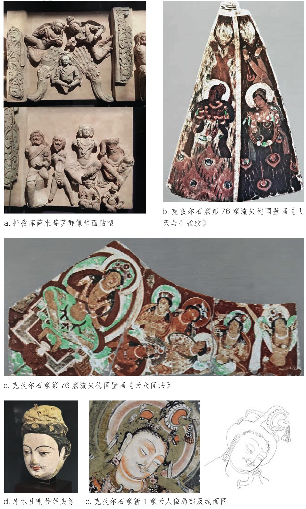 图1 a.笔者摄于法国巴黎集美博物馆b、c、e.采自赵莉著:《克孜尔壁画复原研究》上,上海书画出版社2020年版,第200页d.日本东京国立博物馆藏