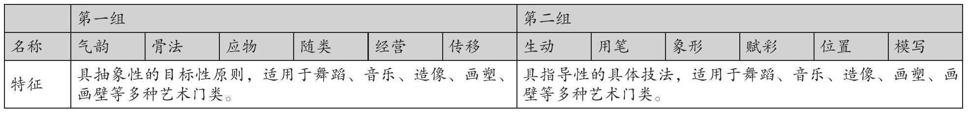 因此,“二、二字”断句之后我们看到了脱离品评语境桎梏的“六法”——气韵、骨法、应物、随类、经营、传移与生动、用笔、象形、赋彩、位置、模写一一对应,作为“技法”与“标准”结合的“六法”真貌由此清晰显现,即一为目标名词,一为技法实现。现将“六法”依“二、二字”断句分组列表比较分析如表1。依照表1,可以尝试做两方面解读: