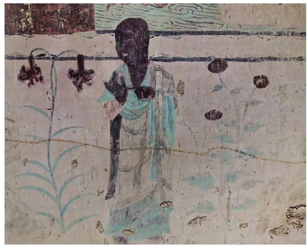 莫高窟作为古丝绸之路上的交通要塞,向来有“华容交汇一都市”的美称。尤其是唐代以来,莫高窟与中原的交流更为密切。其中唐代前期诸多洞窟壁画因受长安影响而风格大变,已经成为学界乐道并普遍接受的事实。正是在这一背景下,莫高窟入唐以来的洞窟中开始出现蜀葵、萱草等图像,且与京畿地区墓葬中的同类图像在造型、位置等方面具有高度的一致性。这种现象也从另一方面说明了敦煌与内地文化艺术交流的广泛与深入程度,继而可以解释新疆地区石窟中也出现蜀葵、萱草等图像的原因。