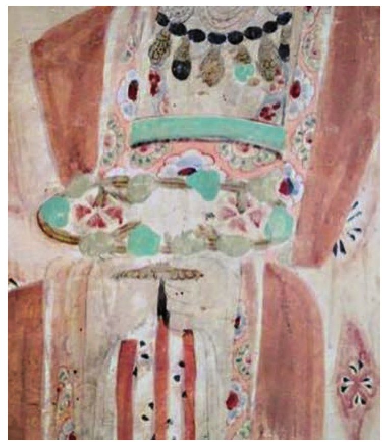 另外,从唐代开始,莫高窟绘画中菩萨、供养人手中持蜀葵花枝,手托盛放蜀葵花朵的花盘以及人物周围飘浮蜀葵花朵的画面开始出现并在宋代及之后普遍流行。斯坦因掠走绢画中有一幅唐代(9世纪中期)的《二观世音菩萨像》,其中一观音手拈黄色蜀葵花(图14)。莫高窟五代第61窟南北两壁及东壁下部画供养人近五十身,大多双手捧花盘,盘中盛蜀葵花三朵(图15)。