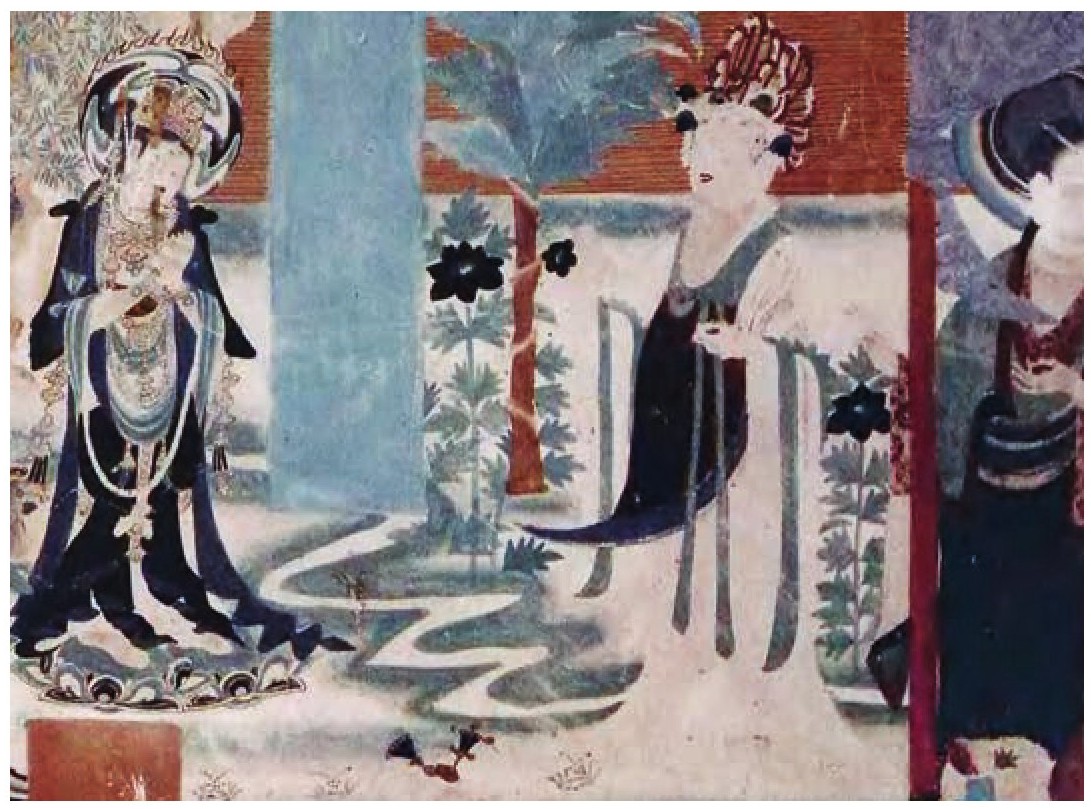 唐代是政治经济上极盛的国度,也是文化上兼容并蓄的国度,此时的佛教不仅走完了中国化的道路,也正在经历着世俗化的进程。花鸟画也在去瑞物性的过程中不断向人间庭院和自然表达过度。在这种情况下,蜀葵、萱草等传统花卉一方面被作为审美对象被赞美,另一方面,其固有的本土象征寓意被唤醒,成为文人士大夫包括佛儒兼备的高僧们表达人生情怀、借喻“孝亲”与“忠君”思想的一种媒介。而这一切都为莫高窟壁画中蜀葵图像内部传统的形成做好了应有的准备,以致在北宋、回鹘时期加以发展改进后大面积绘制。至西夏时期的壁画中达到高峰,成为莫高窟花卉世界中一道亮丽的风景。