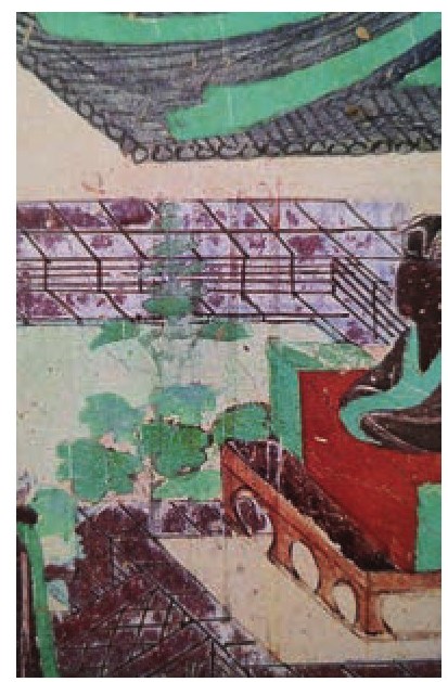 第二类是单株式。如莫高窟盛唐第126窟龛内屏风中的两株蜀葵(图30),第34窟前室西壁窟门南侧五代绘的蜀葵。其特点是单株,笔直挺拔,与旁边的人物等高。早在长安章怀太子墓石椁线刻画中即可见到此类蜀葵(图31)。王公淑墓中的蜀葵花虽非高大形象,但一枝挺立,也可视为同类。柏孜克里克第65窟的蜀葵也与此相似。及莫高窟宋、回鹘、西夏时期,蜀葵则以单株式重复并排直立为主。这即说明单株式蜀葵图像早在唐代京畿地区就已经出现,并对莫高窟及新疆等地的同类图像产生了影响。