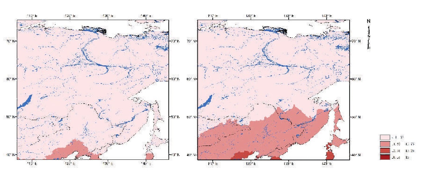 图三 本文所涉及东北亚地区在间冰期气候条件中狩猎采集者投影下的生计侧重(SUBSPE,左)和一倍拥挤条件下投影所得生计侧重(D1PSUBSPE,右)