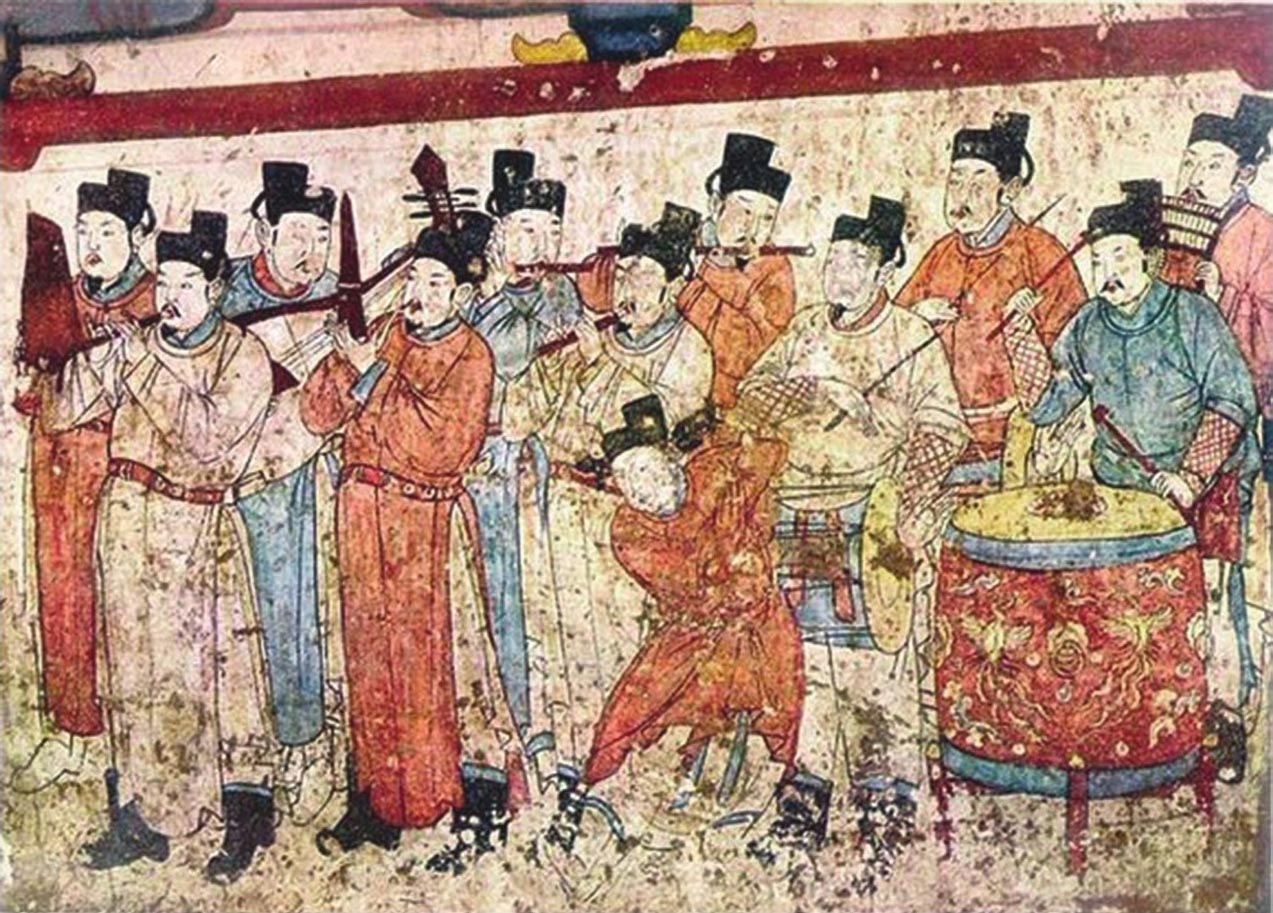 又《歌乐图卷》中手抱琵琶的男艺人(图11)、宣化辽墓壁画《散乐图》中的吹乐艺人(图12)也戴曲翅幞头,可见曲翅幞头的受众极广,不仅包括仆役或公差吏卒等低级官员,更涵盖辇官、甚至身份卑微的艺人。