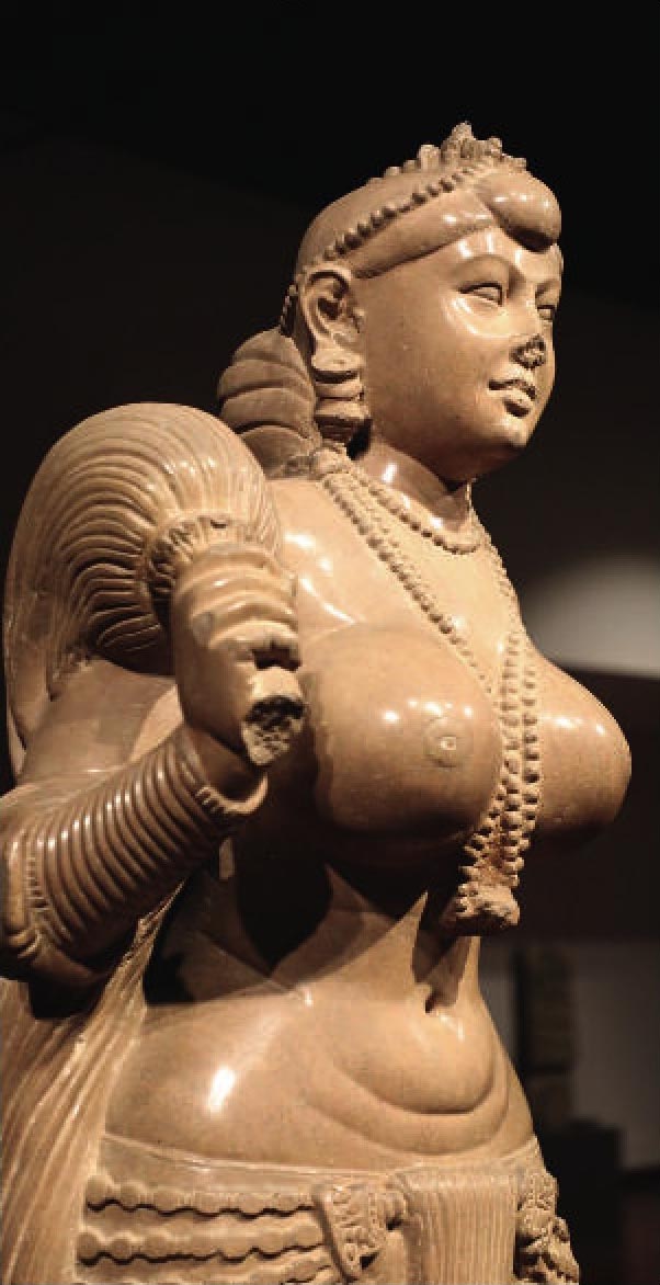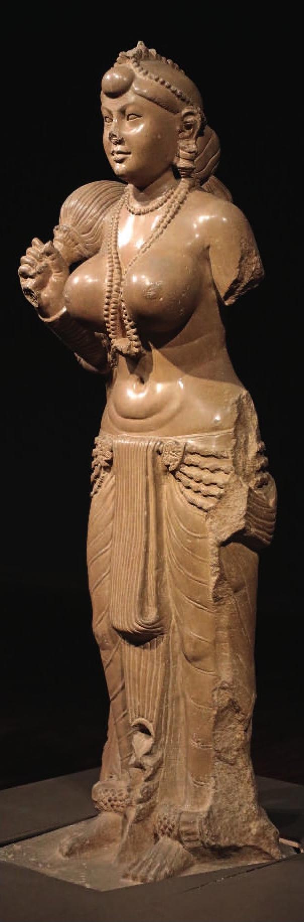 这尊真人尺寸的雕塑由浅黄色砂石精心打磨而成,高度抛光。代表了一种古印度理想主义的女性人体。这尊雕塑于1917年在恒河岸边的大甘吉巴特那地区被发现。一位名叫毛拉维·古拉姆·拉苏尔的男子在追捕一条蛇的时候发现了这尊被河床淤泥掩盖的精美塑像。