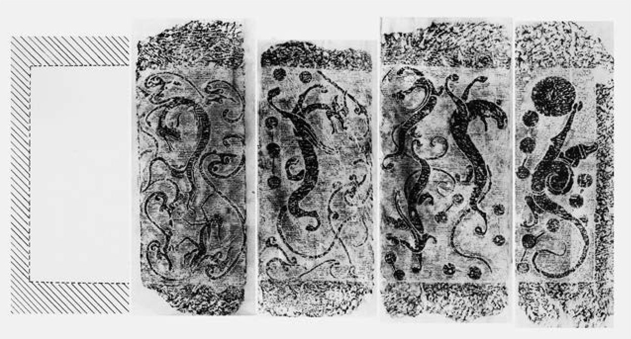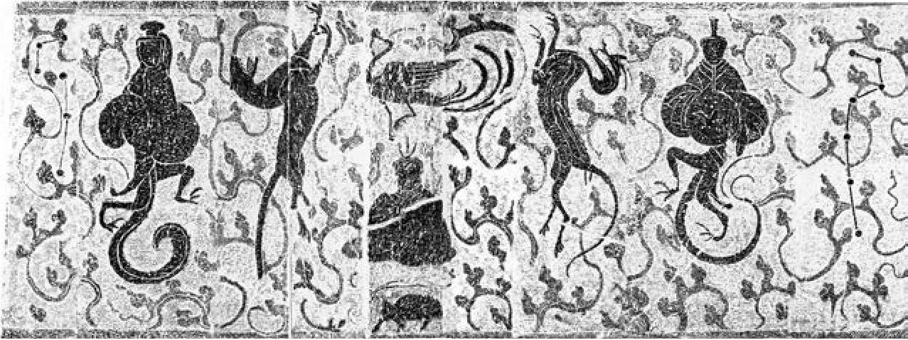 3.山东梁山后银山壁画墓,在西壁画面的上层天界图里出现人身蛇尾的伏羲,此墓的特点是出现了珍贵的“伏戏”榜题文字,但女蜗图像没有出现。