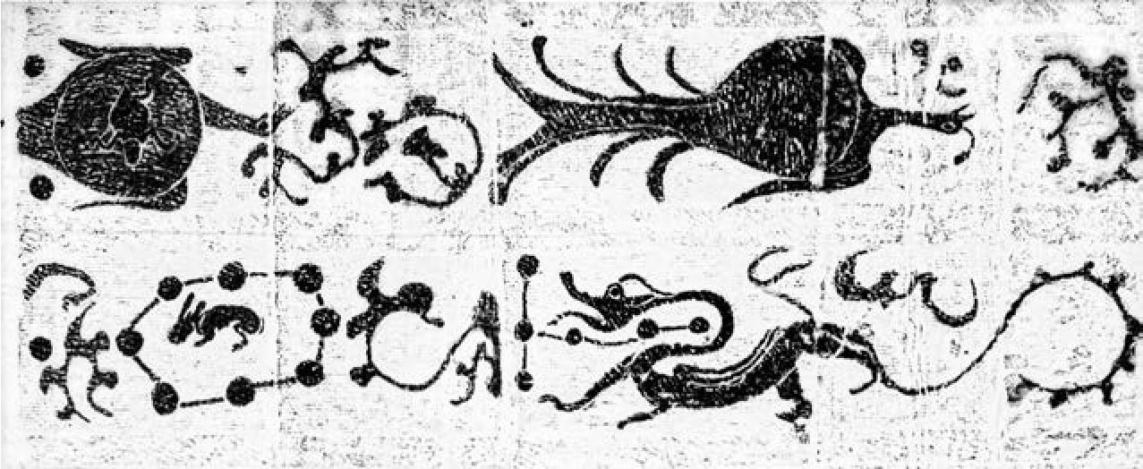 类似的天象图在西汉壁画墓和东汉画像石墓中都有许多例子,就像前举南阳麒麟岗、南阳宛城区东关汉画像石墓那样,所见天象图诸例都用于墓顶。西汉壁画墓,在主室顶脊描绘天象图的例子很多。这些壁画多呈现长条形,两端为伏羲女娲,中间为各类灵异星象。长沙马王堆一号汉墓帛画,现藏湖南省博物馆,全画高205厘米,上宽92厘米,下宽47厘米,帛画上端表现的也是天界,左上角是蟾蜍月轮,右上角是三足乌日轮,同样是日月经天、群龙翔空的神异景象。虽然形制不同,布置有别,就其立意而言,与墓室画像石的图像结构却是同出一辙的。