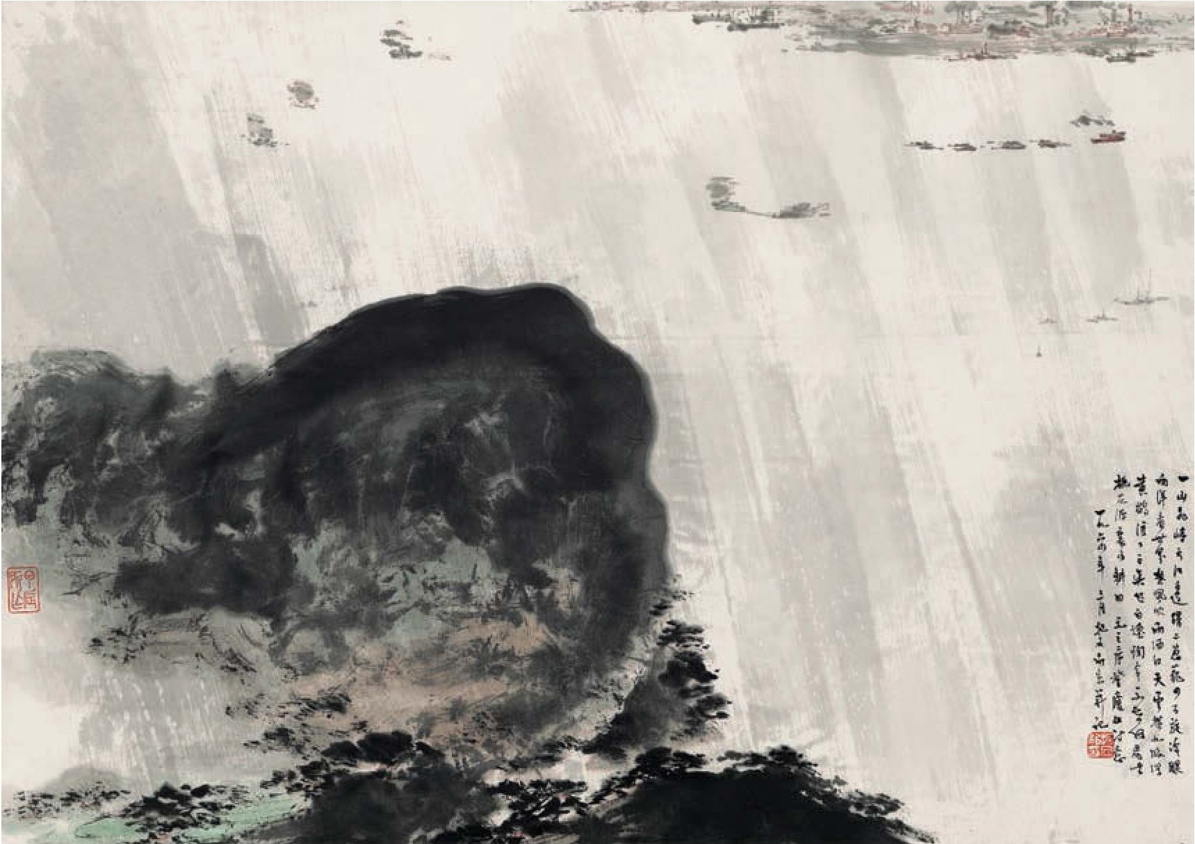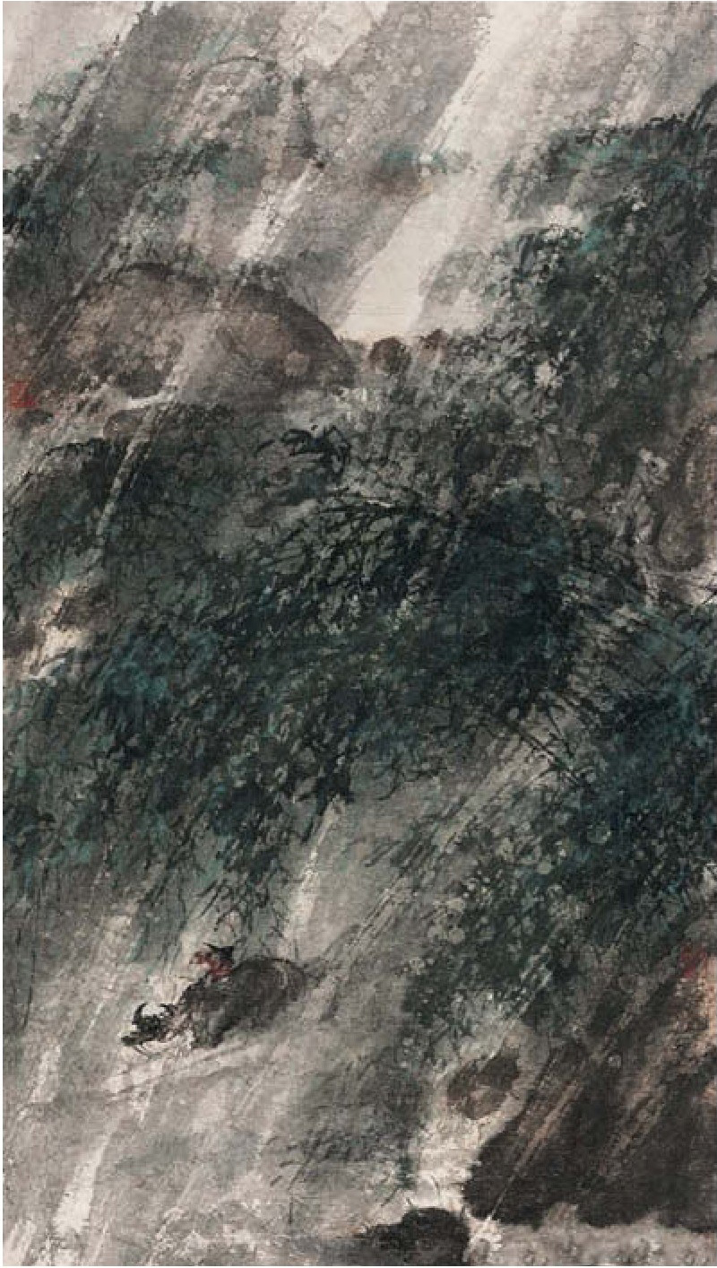 两年以后的1944年他在重庆又举办一次个展,《万竿烟雨》一类作品问世,他的山水画新技法“抱石皴”已基本形成风格。随后《潇潇暮雨》《风雨归牧图》《听瀑图》《千峰送雨》等新作接二连三,让人耳目一新。傅抱石使人信服山水写真是可以赋以山水新的生命,作品也是可以打破传统笔墨约束而求得气韵生动的。傅抱石的成功主要表现在两个方面:第一,画面主观客观高度的统一,与同时期其他画家相比他的作品更激情澎湃,感染力特强;第二,技法独创,为我所用,新颖独特,意象万千,这几乎让世人瞠目结舌。