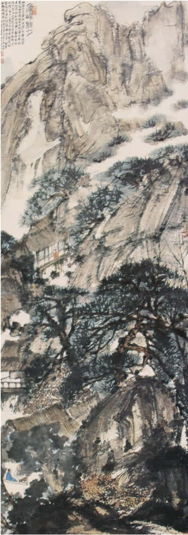 他画山水画中的屋宇、楼阁等建筑物,不用古代界画中上宽下狭的办法,而采取平视,不管高低的建筑物都平视,而山峰树木则按“三远”法处理,故不同于西方的焦点透视,也不同于中国画的散点透视,但看起来很舒服、自然。通过写生,他特别能抓住地方特征予以表现,譬如富春江常绿浓黑的杨梅树,浙江农村秋天变红树叶的乌桕树,黄山粗壮千姿百态的松树。这些景物有地方特征能激起画家心中之情,是创造意境不可少的东西。
