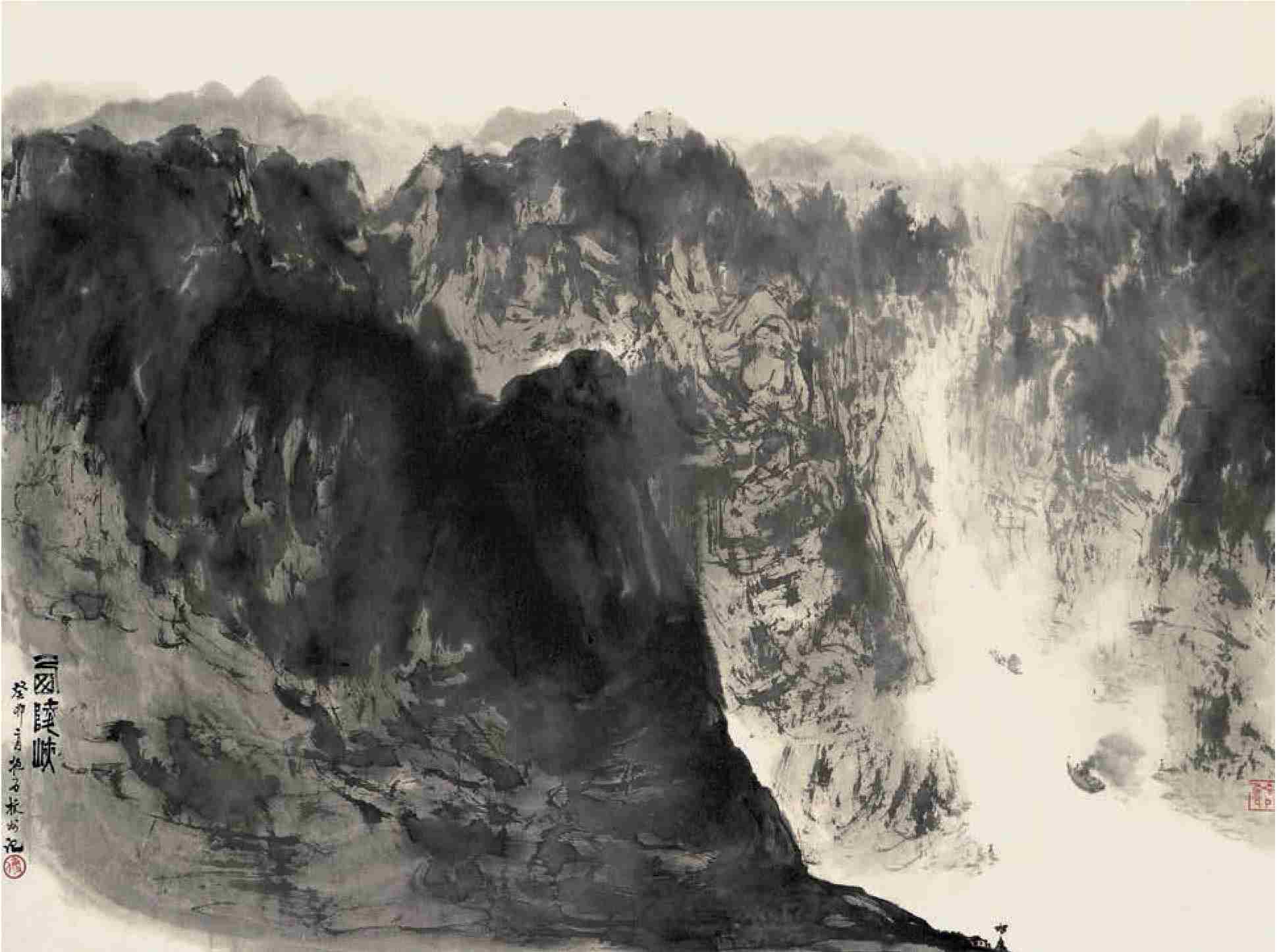 在四川特定的自然环境中,表现大气湿润,烟雾迷茫,非“线”能够胜任,傅先生把线扩展成面,发挥渲染的作用,使传统的点、线及各种皴法笼罩在大气之中,似有非有,夸大大气之气势,减弱点线之局部,使局部服从整体。