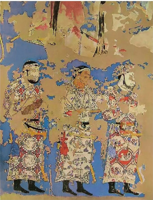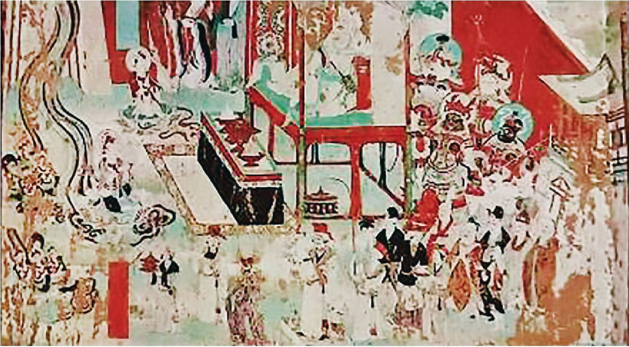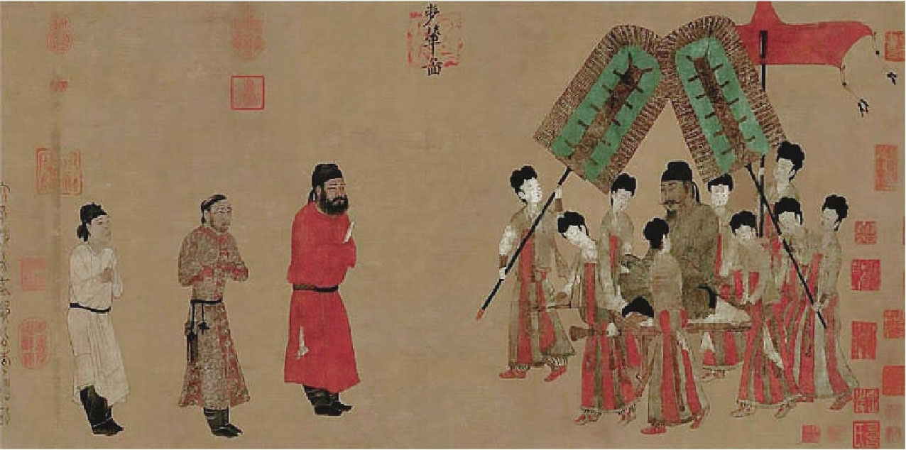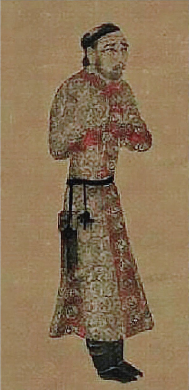 作为吐蕃王朝使臣的禄东赞因为迎娶文成公主而声名显赫,但因有其光辉形象在《步辇图》上(图1),也随之名扬四海。而“赤鄂衍那使臣”不是历史事件中真实存在,但这组形象却永远定格在撒马尔罕古遗址大使厅壁画西墙,留给考古学家和历史学家不断地考证和研究。《步辇图》之吐蕃使臣禄东赞与大使厅壁画三人组合“赤鄂衍那使臣”,两个使臣队伍缘何能隔空交集,这皆因史书所记载的“番客锦袍”。不同地域不同空间的他们却因身着风格相似的衣着,使得笔者将其诉诸笔端,拟从《撒马尔罕大使厅壁画》(图2)与《步辇图》所描绘人物形象的共性入题,并结合同时期的相同文物特征,以期与方家共同探讨“番客锦袍”在异域间风行一时的背景及原因。