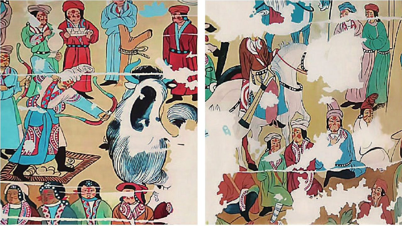 综上所述,《撒马尔罕大使厅壁画》三人组合“赤鄂衍那使臣”,《步辇图》迎娶文成公主的吐蕃使臣禄东赞,两个使臣队伍原本看来毫无关联的隔空交集,经过以上分析研究才发现两者间渊源深厚。正因为吐蕃深受波斯文化影响,所以才出现了两支使臣队伍皆身着锦袍的场面。虽然文成公主入蕃带去养蚕技术,但无吐蕃本身生产丝绸的记载。吐蕃通过对外战争和贸易使丝绸不断进入吐蕃,唐朝皇帝馈赠给吐蕃君臣的礼物中最主要的也是丝绸。有专家认为,青藏高原自古以来就与外界保持着密切的联系与交流,史前时期已有固定的通道。处于亚洲腹心地带的吐蕃王朝极大地拓展了对外交流的孔道,形成网状结构的交通路线,主要是向南和向西扩展,向南到达尼泊尔,向西既可以南下与这条古道汇合,也可以继续向西,进入中亚地区。这两条干道是连接“丝绸之路”不可或缺的主干道。