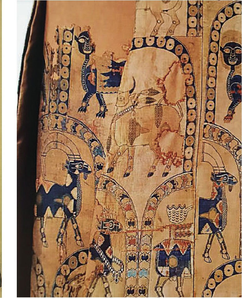 西亚古代的织物原料,主要是亚麻和羊毛,因为亚麻不易染色的缘故,所以其彩色织物基本上都使用羊毛。斜纹组织是西亚波斯织锦的另一大特色。这和底地是平织物、经线起花、夹纬是单线的汉锦有所不同。在花纹方面,波斯锦不像汉锦花纹布局那样横贯全幅,而是用联珠圆圈分隔为各种花纹单元。花纹题材中,如野猪纹、萨珊式立鸟纹等,也和中国织锦(图10)有所不同。