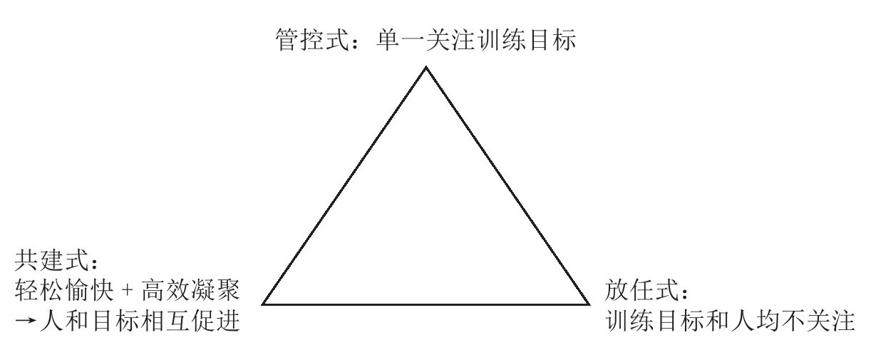 依据公共管理学的理论与评估团队关于教育公益类项目的模式梳理,以及生活重建训练的运作形态,“新起点”尝试建立了关于三种训练模式的分析框架。如下图所示,当将脊髓损伤者集中起来训练时,通常有三种可能的情形:一是管控式,只关注目标是否达成,相当于只有“事”的侧面。任务是否完成,效率和质量是核心,通过高强度的、机械的、枯燥的训练来达成目标,人与人之间的关系、人的内心感受则不予关注。二是放任式,既不关注“事”,也不关注“人”。只提供集中训练的场地和机会,对目标和伤友都不重视,按部就班完成一节节的课程即可,过程随意、结果随机,很有可能有形无实地空转一场。三是共建式,既关注“事”,也关注“人”,一个侧面是有对于“事”的追求,高效地达成目标,另一个侧面则是对于“人”的追求,人的内心、情绪状态以及人与人之间的关系也被纳入进来,且“人”与“事”相互促进,有更好的人际关系,人在其中出场,促进目标的达成,在对目标的追求中又进一步凝聚了人际关系,最终形成既轻松愉快又凝练高效的训练模式。