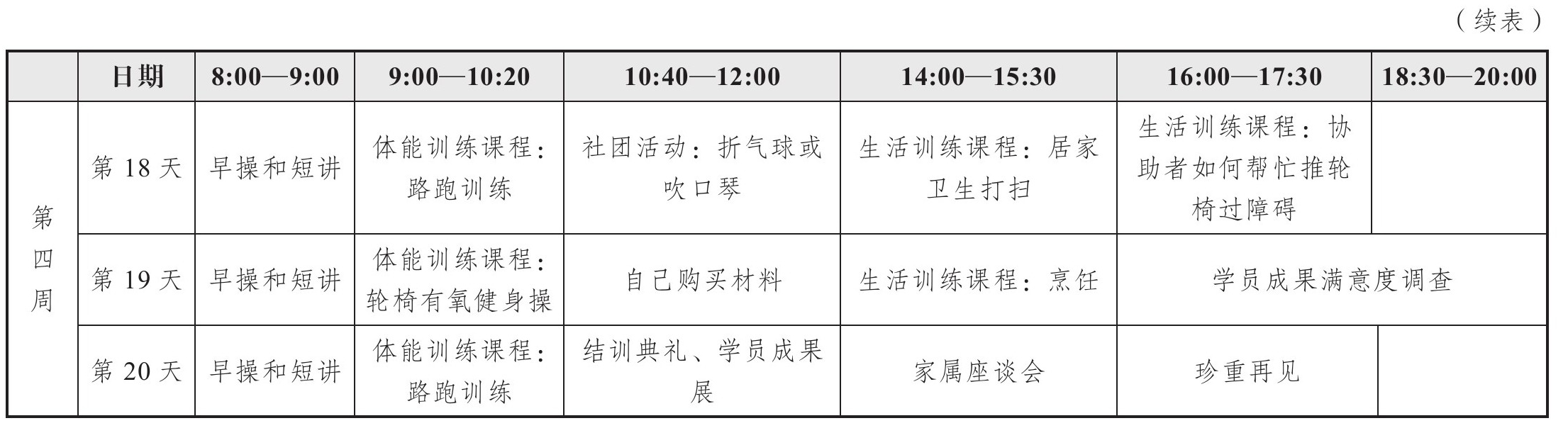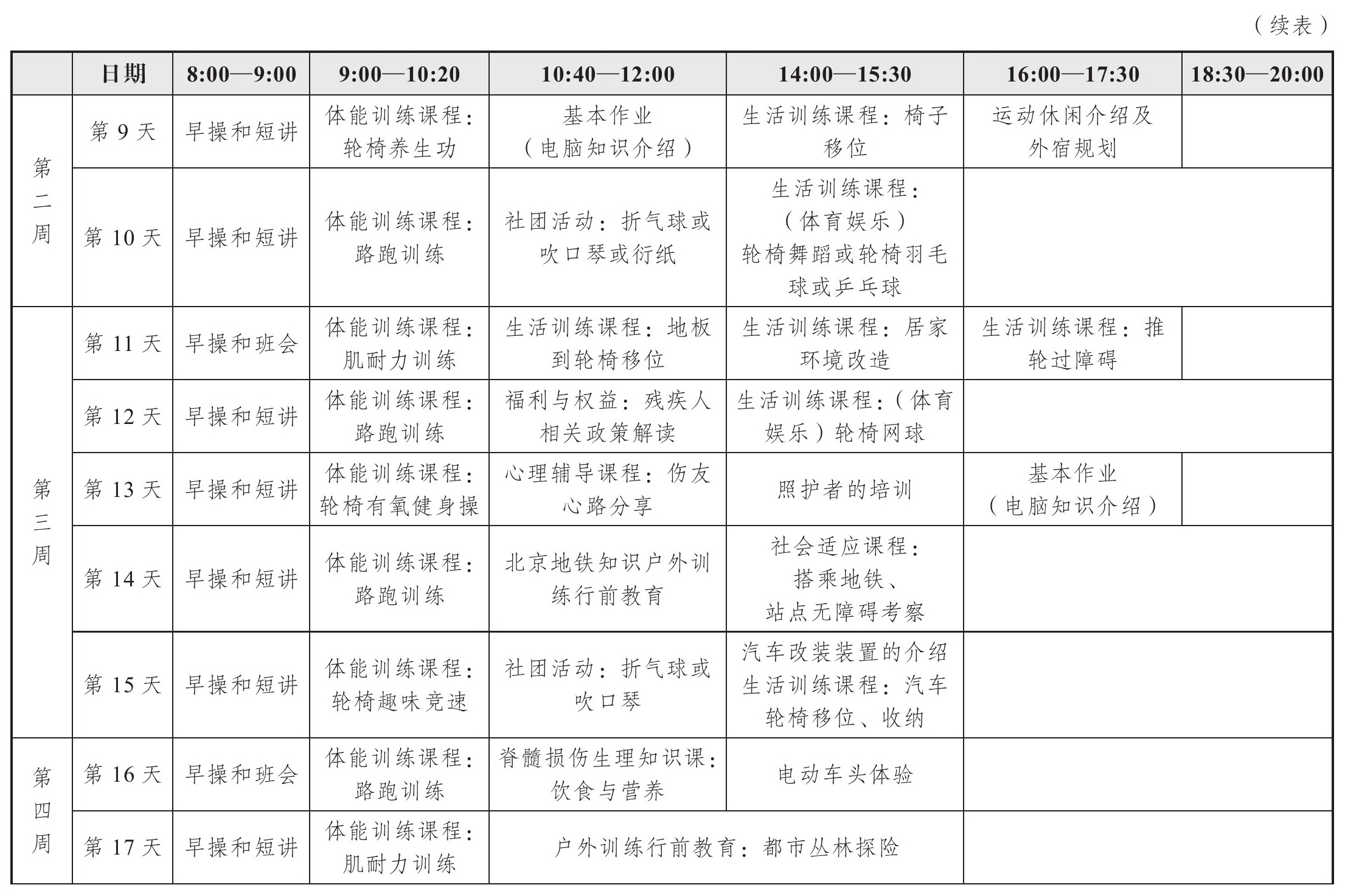 以下表格呈现的是胸腰椎类伤友在生活重建训练营的课程表。不同类型的伤友的课程表会略微有所调整,进行个性化设计。每一期训练营的课程都会有20%的留白,会根据伤友参加训练营的实际状态进行调整。不同伤友受伤的阶段、程度不同,其身体能力也会不同,“新起点”在设计课程表时综合考虑了此情况,每个课程都有20%-30%的留白和调整。