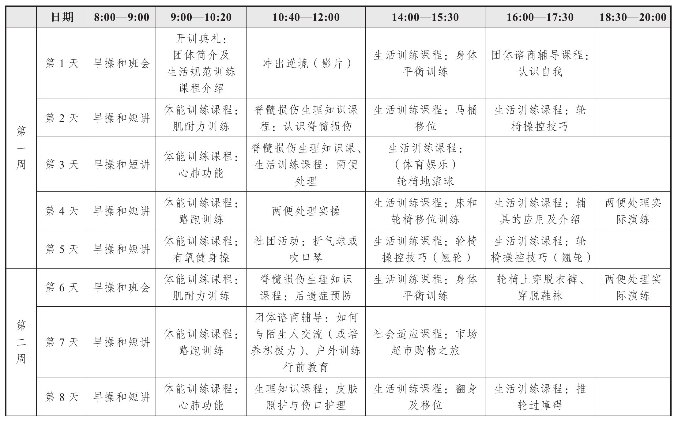 该培训是28天或48天的集中培训, 培训课程一共分为七大主题:基础知识、体能训练、生活能力训练、社会适应、团体心理辅导、文体娱乐活动、其他。 这七个方面的内容分解成60多个具体的、可创造正面感受的“生活任务”,我们让受训伤友利用现有的运动、认知和交流功能,学习多领域知识,利用代偿生活技能等方法,逐一攻克“生活任务”,最终实现生活自理或减轻照顾者负担的目标。