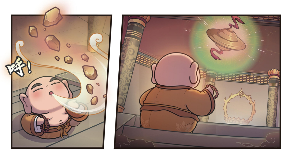 00 弥勒佛来到莲台上,取回碎金,吹了口仙气,念了声咒语,只见那碎金聚在一起,恢复成了完整金铙的样子。