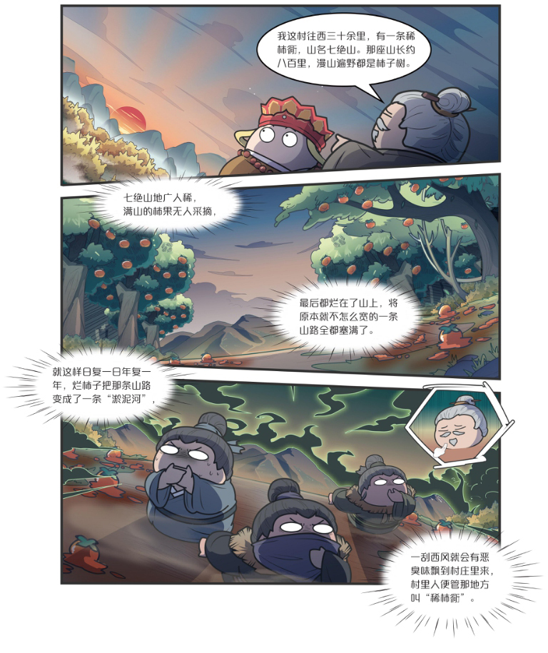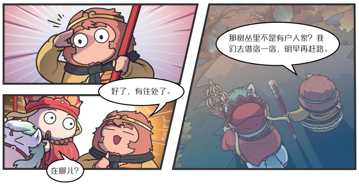 师徒四人边走边聊,突然悟空看到不远处有座山庄。