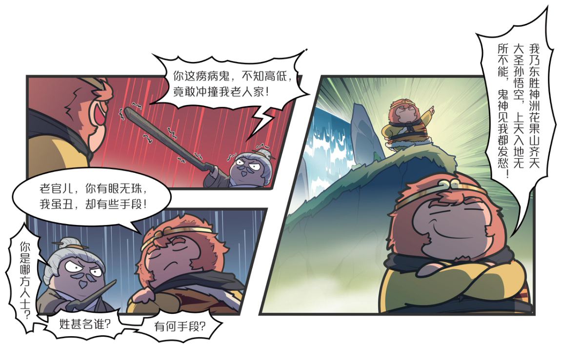 老人见悟空相貌丑陋,心里有些害怕,但他还是壮起胆子喝了一声,用藜杖指着悟空。