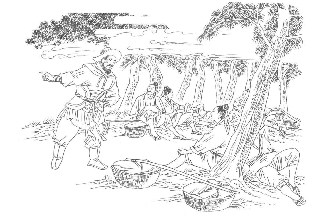对面松林里那伙贩枣子的客人听见动静赶来,问:“怎么了,闹什么呢?”挑酒的汉子说:“我挑着这酒过冈子到那边村里去卖,热了在此乘凉,他众人要买酒,这个客官却说我酒里有什么蒙汗药,你说好笑不?不知怎么想的!”贩枣的劝说:“我们以为来了强盗,原来是卖酒的,不如这样,我们也正渴,就卖给我们一桶吧。”挑酒的说:“不卖!不卖!”七个人都来劝,又去拿钱和瓢。后来挑酒的同意了,七个人高兴地立在桶边,开了桶盖,轮换着舀那酒吃,一会儿一桶酒都吃尽了。众军兵看得眼馋极了。七个客人付了五贯钱。这时,一个贩枣的揭开另一桶酒的桶盖,又偷了一瓢酒,那卖酒汉子去夺,贩枣的便跑,卖酒汉子气得去追。这时另一个贩枣的也用瓢去偷酒喝,被那汉子看见,跑回来劈手夺回,倒回桶里。他盖紧桶盖,将瓢摔在地上,口里骂道:“你们这帮人连吃带偷,真没规矩!”