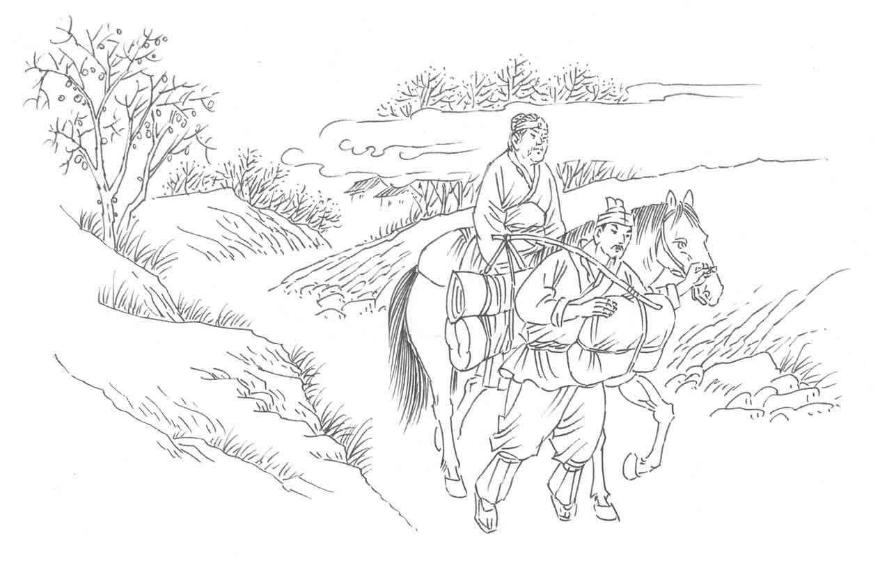 王进没有妻子,只有一个六十多岁的老母亲。他回家后,对娘说完此事,母子二人抱头而哭。母亲说:“我儿,‘三十六着,走为上着’。只怕咱们没处躲啊!”王进思忖了一会儿,说:“母亲说得是。镇守边防的延安府 老种经略 [3] 相公,为人正直,手下也有些军官曾到京师,爱惜儿子使枪棒的本事,何不逃去投奔他们?那儿是用人之处,足可安身立命。”商议妥当,母子俩急忙收拾东西,趁着夜深人静的时候,逃离了东京。