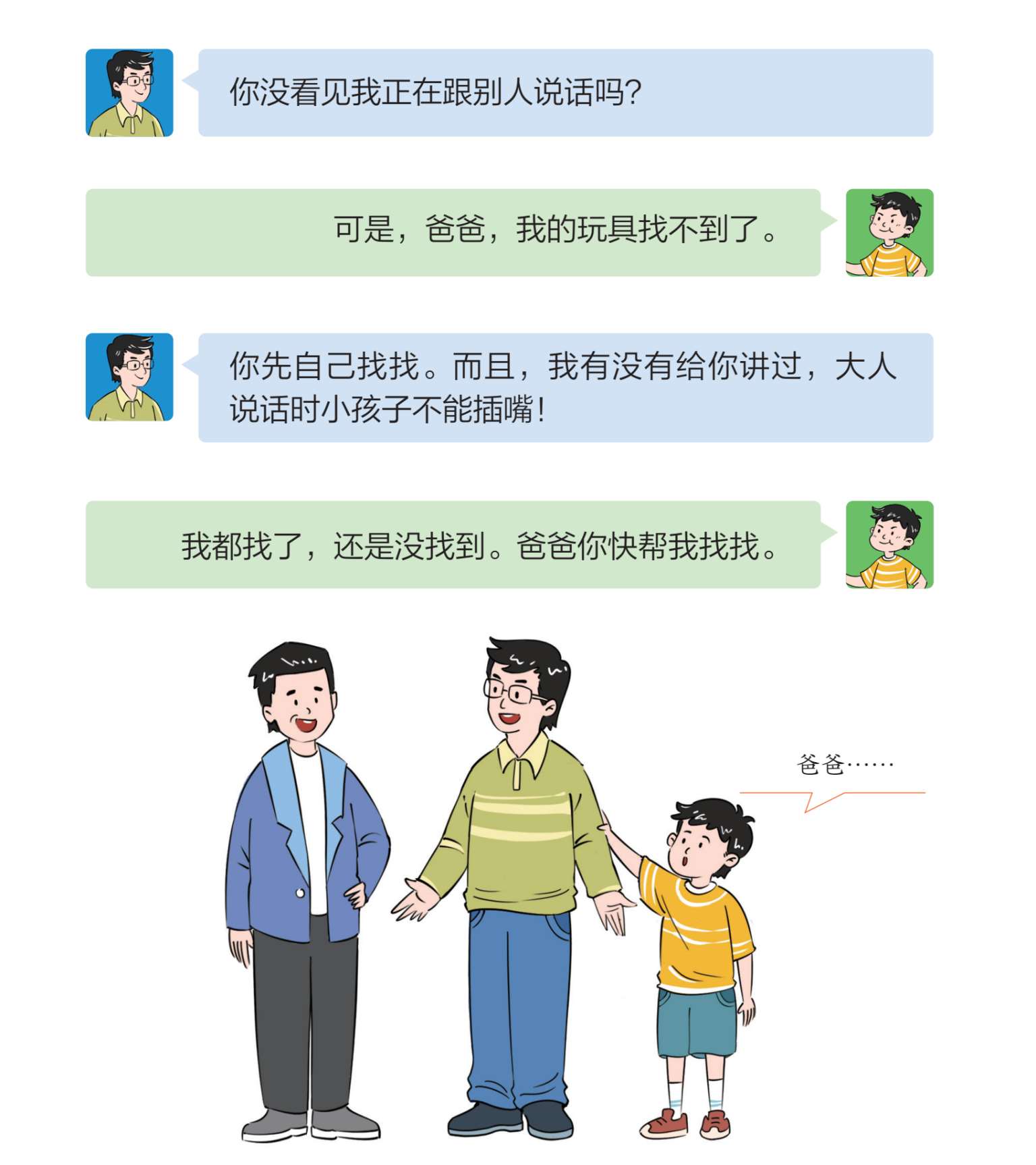 “大人正在谈话时,如果你总在旁边插嘴,势必会干扰大人交谈。这是非常不礼貌的。”