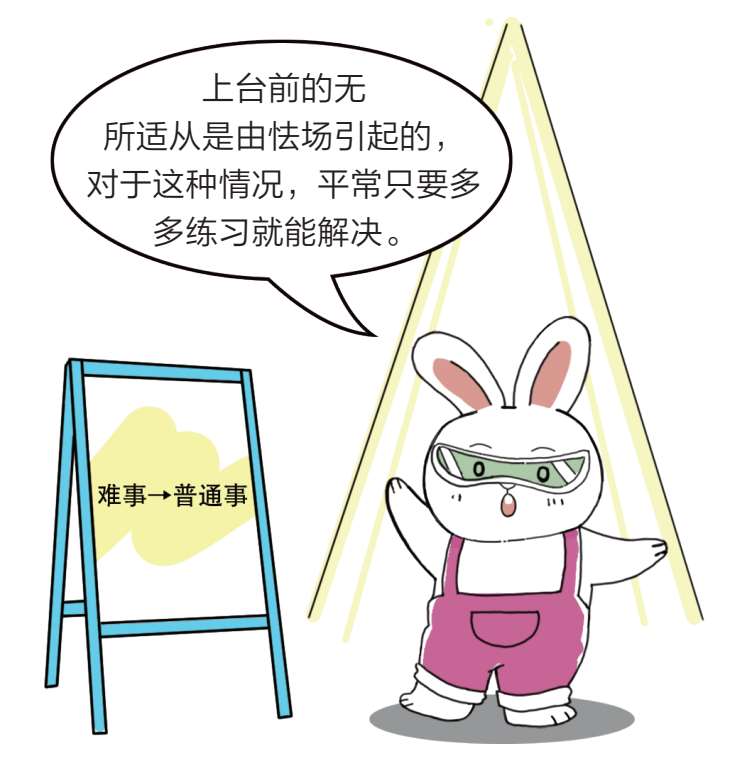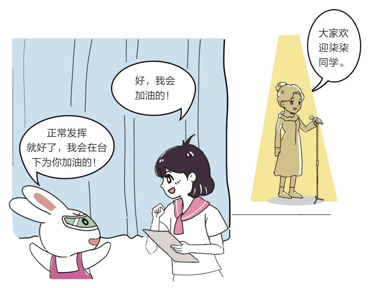 兔十一告诉柒柒:“上台前紧张是很自然的一件事,千万不要有当逃兵的想法。就把这次演讲当成锻炼和成长的机会吧!”