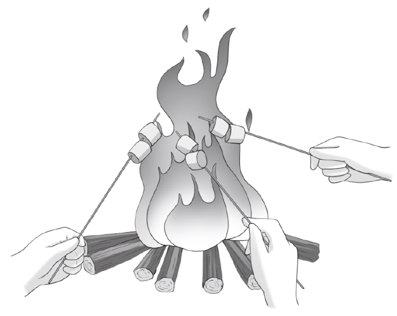 “噢,看哪,我的棉花糖都烧着了!”马特大叫。他对着棍子吹,吹灭了火苗。他把烧得黏糊糊的棉花糖从棍子上扯下来,弄得满手都是。
