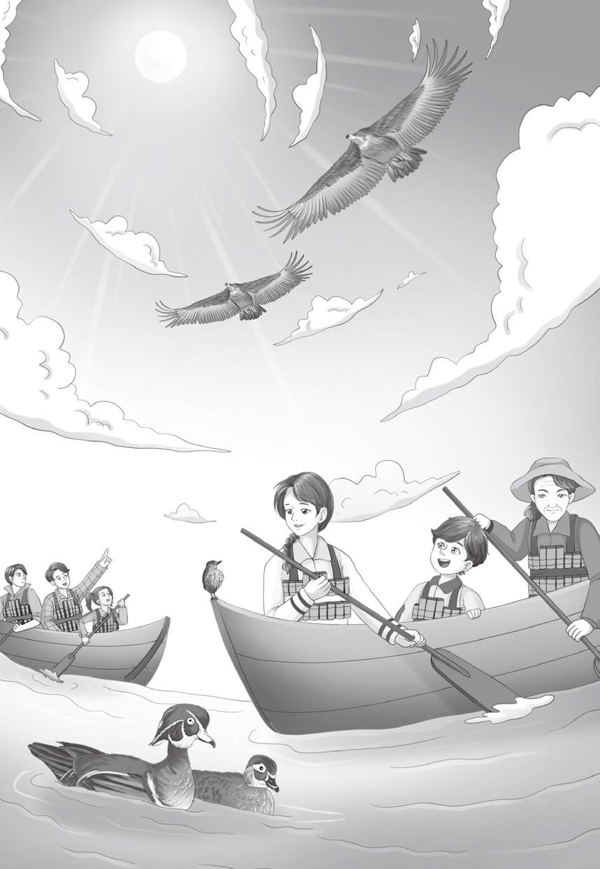 湖水平静,他们轻轻地划着独木舟,看见林鸳鸯、草地鹨和两只秃鹫。