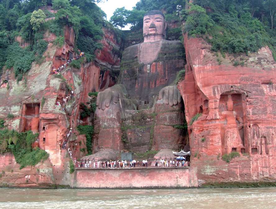 从山脚的报国寺坐车前往乐山市,再乘船向东南方向前行,便可见到著名的乐山大佛。这是在岩石山上雕刻的一尊补处弥勒菩萨像。