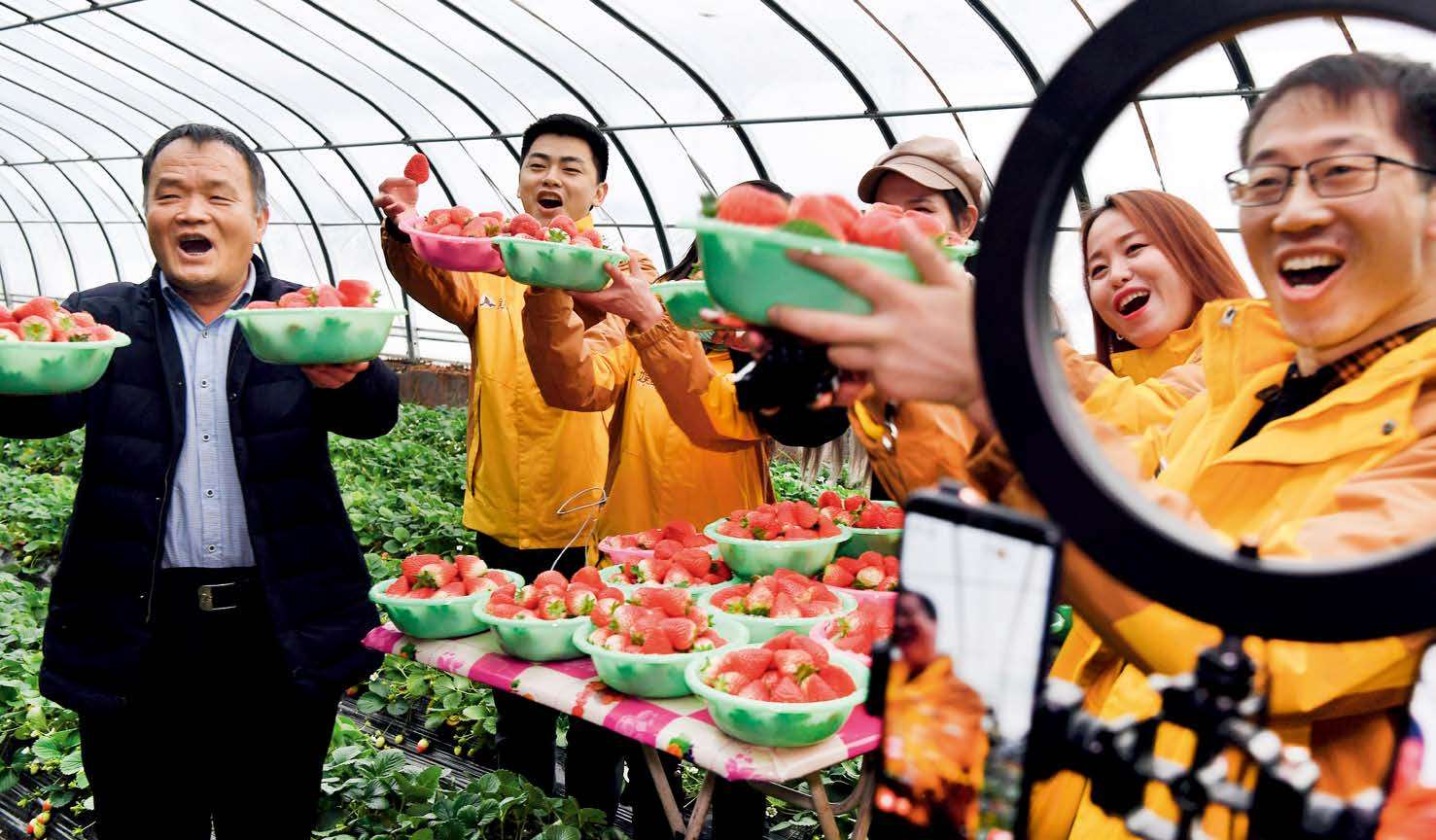 2020 年 1 月 10 日,一家电商平台工作人员在陕西省合阳县金峪镇沟北现代农业科技示范区直播推广草莓。(陶明 摄)