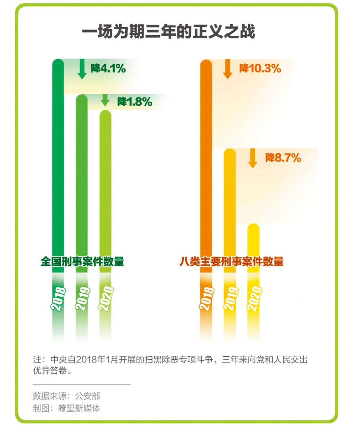 注:2018年1月,中共中央、国务院发出《关于开展扫黑除恶专项斗争的通知》,决定在全国开展为期三年的扫黑除恶专项斗争。这场波澜壮阔、影响深远的人民战争,依法铲除一批群众反映强烈的黑恶势力,深挖处一批黑恶势力“保护伞”,向党和人民交出了一份优异答卷。