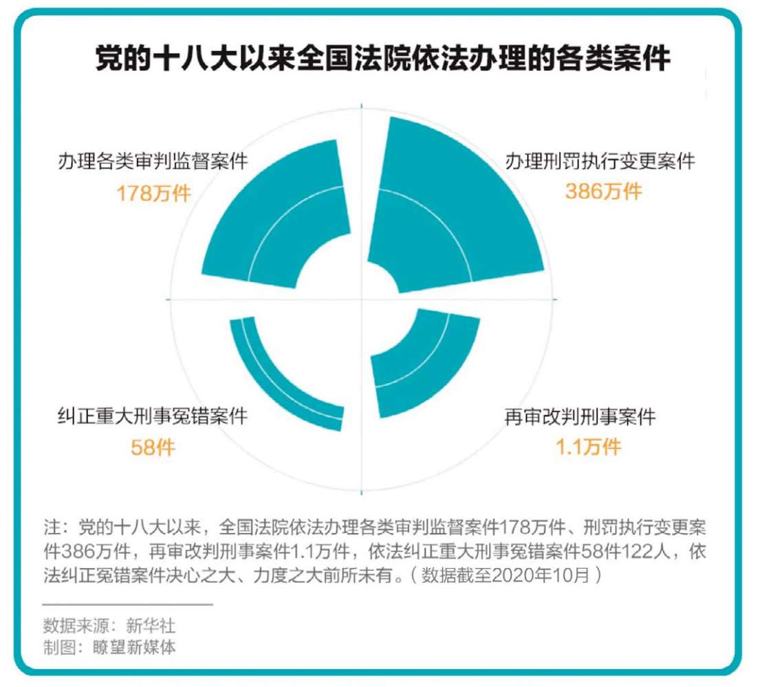 注:党的十八大以来,全国法院依法办理各类审判监督案件178万件、刑罚执行变更案件386万件,再审改判刑事案件1.1万件,依法纠正张氏叔侄案、呼格吉勒图案、聂树斌案等重大刑事冤错案件58件122人,依法纠正冤错案件决心之大、力度之大前所未有。(数据截至2020年10月)