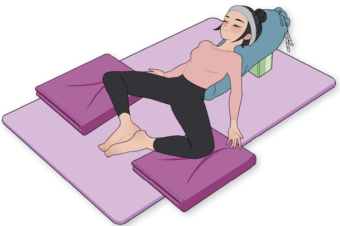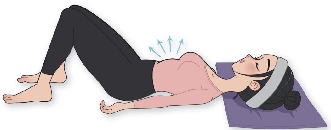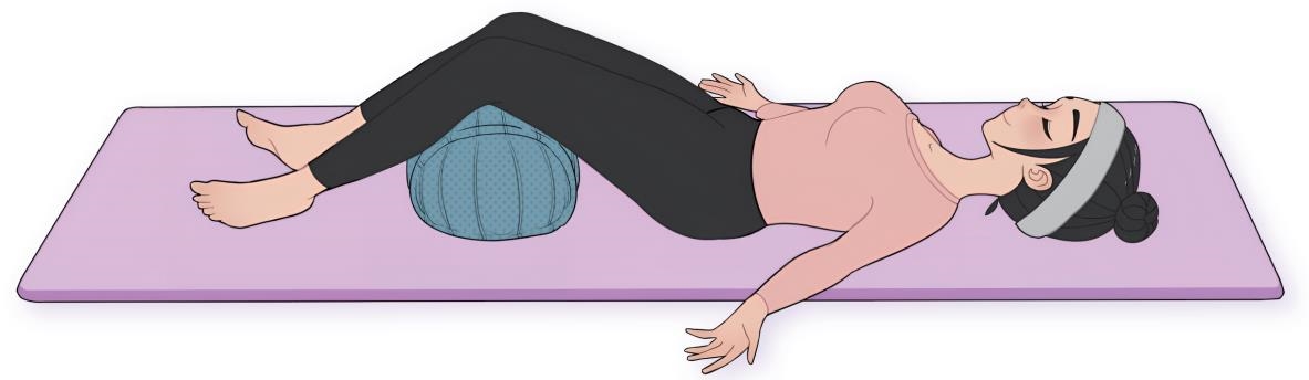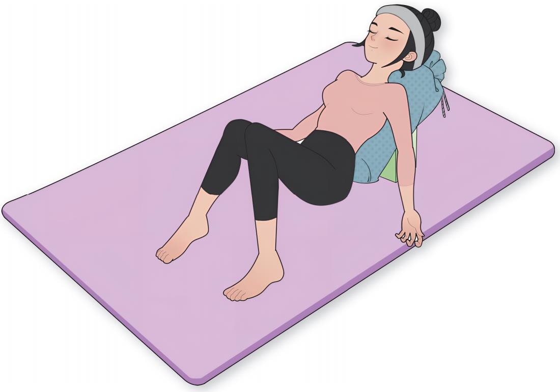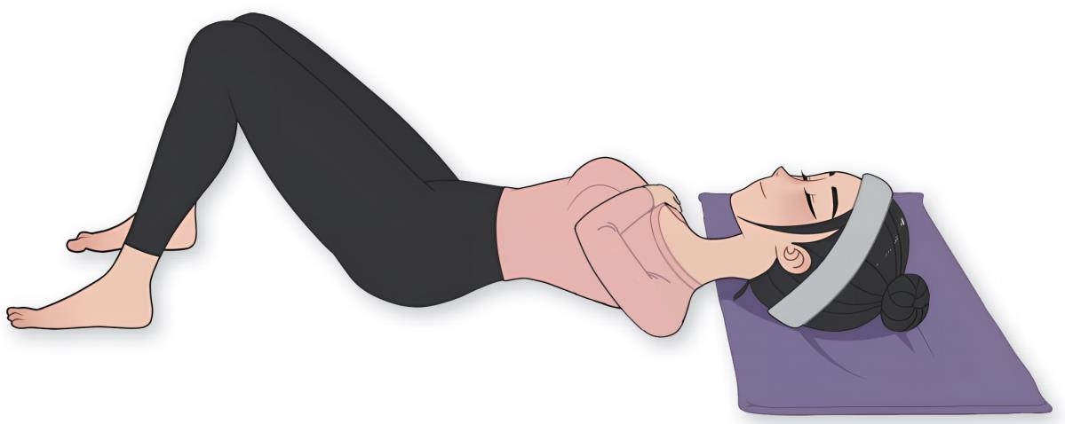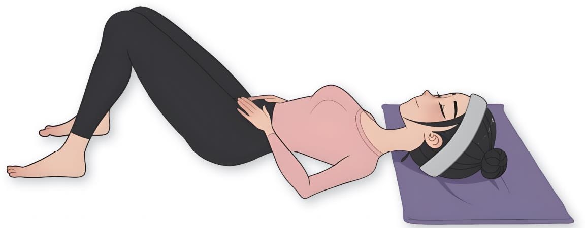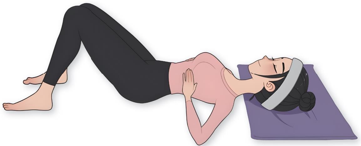 屈膝,双脚分开与肩同宽,仰卧于地面。屈膝可使横膈膜处于放松状态,从而减少腹部张力。可在膝盖下方准备软垫或专用瑜伽抱枕。