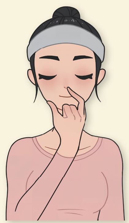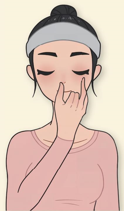 ②右手拇指与无名指分别放在鼻翼的两侧进行练习。拇指轻压鼻翼关闭右侧鼻孔,通过左侧鼻道吸气,然后用无名指关闭左侧鼻孔并通过右侧鼻道呼气。随后,再用右侧鼻孔吸气,关闭右侧鼻孔,用左侧鼻孔呼气,这样算一轮呼吸。重复练习几分钟,找到自己舒适的呼吸节奏。