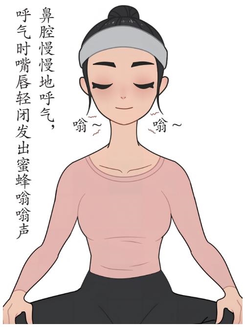 ②轻柔地吸气,通过鼻道感受气息向上流动,去向颅腔内部。呼气时发出蜜蜂一般的“嗡……嗡……”声,能感受到头部被声波振动的舒适感,从而获得大脑的放松与安宁;呼出所有气体时,感觉“嗡……嗡……”声在头顶的惯性传递。循环往复练习。