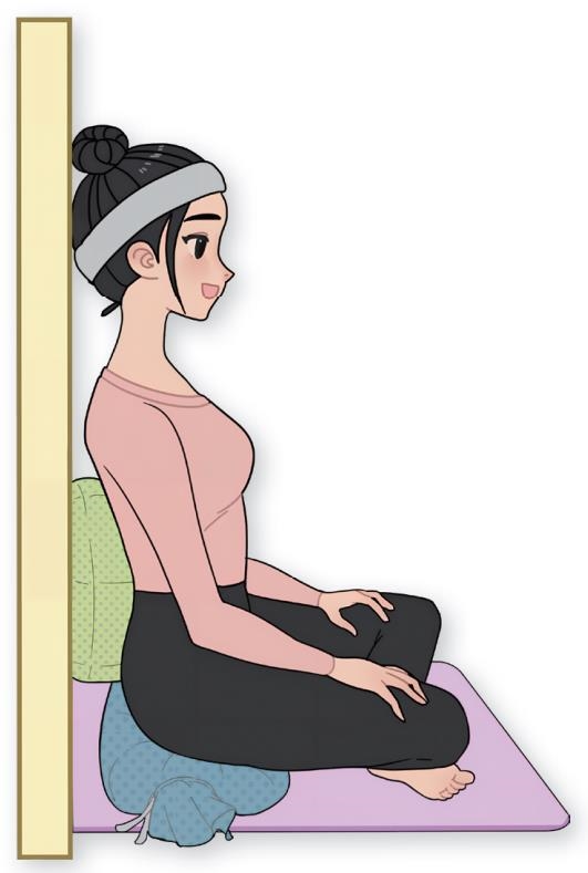 双腿屈膝交叉简易盘坐,臀部下方垫瑜伽砖或折叠毛毯,骨盆高度高于膝盖,双手掌心朝上或朝下,放在膝盖上方。