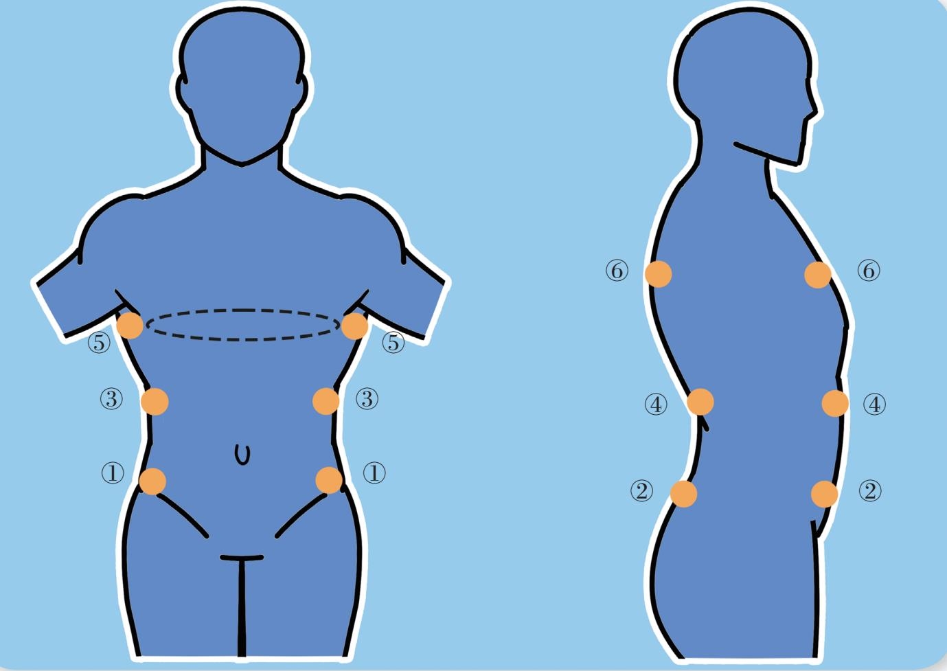 ④初学者应加入手对身体的触碰,通过触觉输入,更易觉察身体的呼吸运动。
