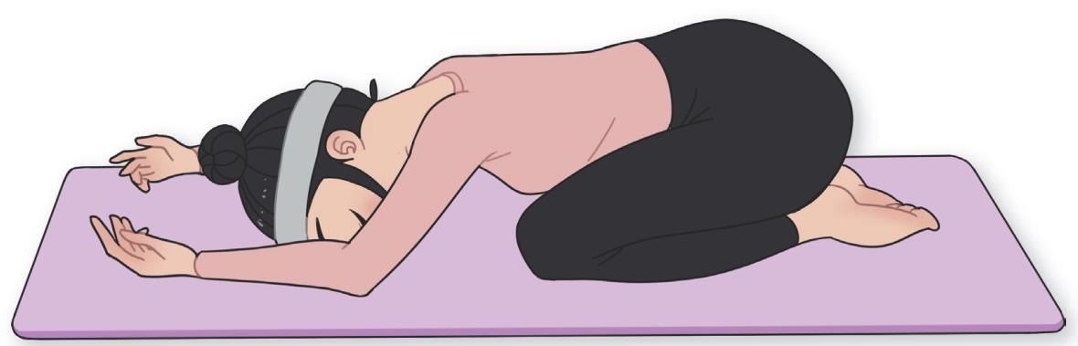 ①跪立于地面,双膝打开。孕期女性需给腹部留出足够空间,向前屈髋,额头着地,臀部可以坐在脚跟上方。可选择俯靠于抱枕或健身球上,这会有效释放脊柱压力。