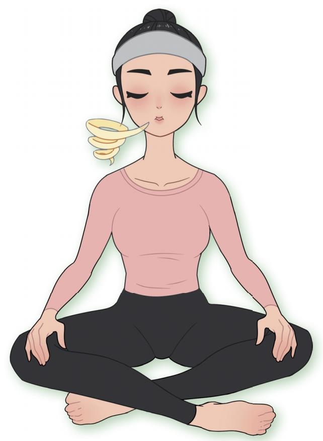 ③嘴唇缩拢,吐气。想象吐出的气息像美丽的金黄色丝线,呈螺旋状往外飘,然后由大逐渐变小,缓慢呼出。