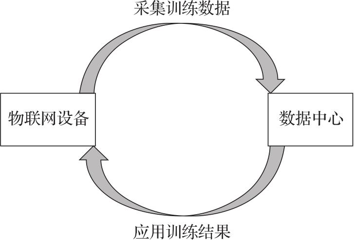 图1-1所示为物联网应用人工智能方法进行数据采集-迭代的循环。通过物联网设备采集训练数据,在数据中心完成训练后,将模型应用到物联网设备,并评估效果进行下一次迭代。